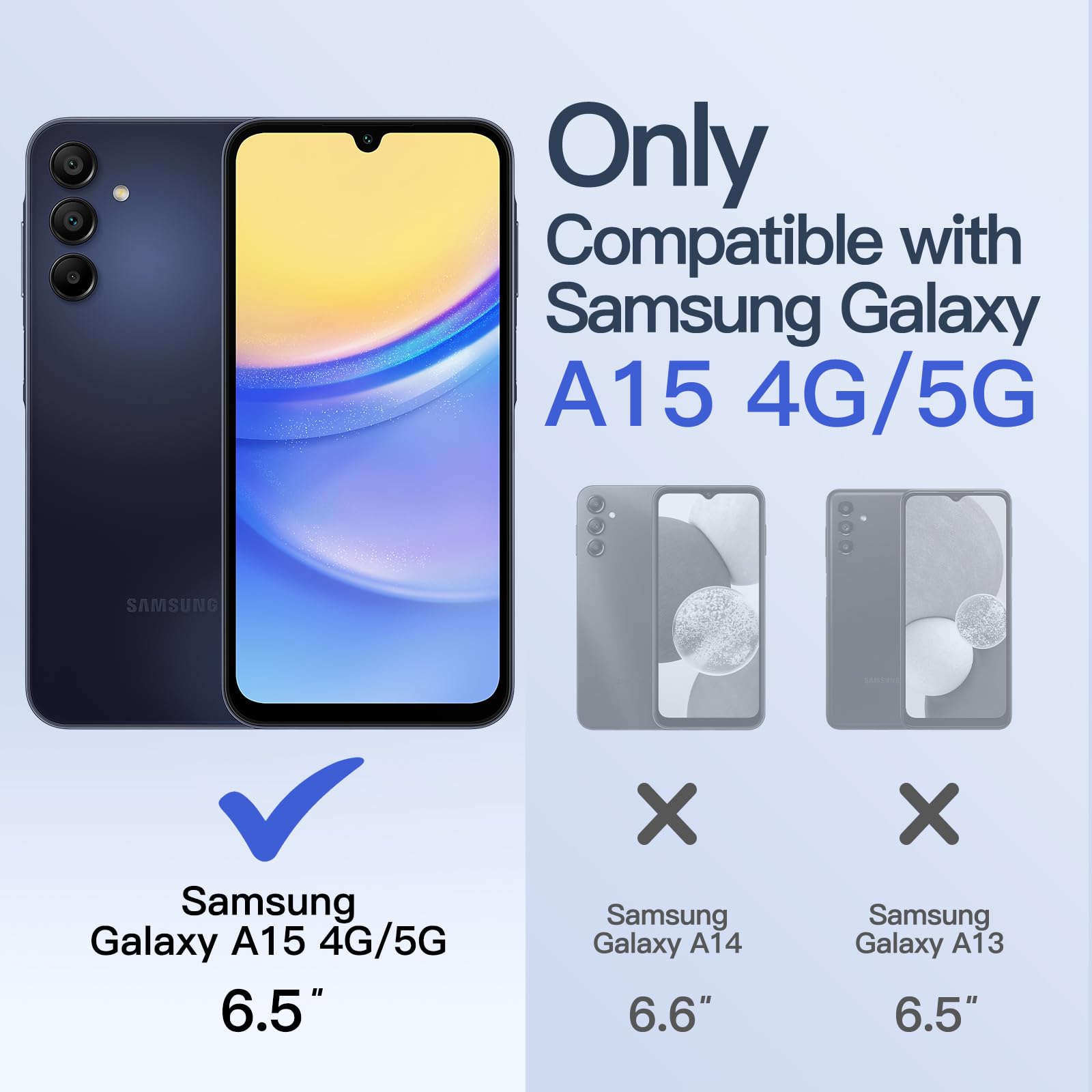 • [Compatibility] Exclusively fit for Samsung Galaxy A15. NOTE: Not for Samsung Galaxy A13 / Samsung Galaxy A14. Please check your cell phone model before purchasing