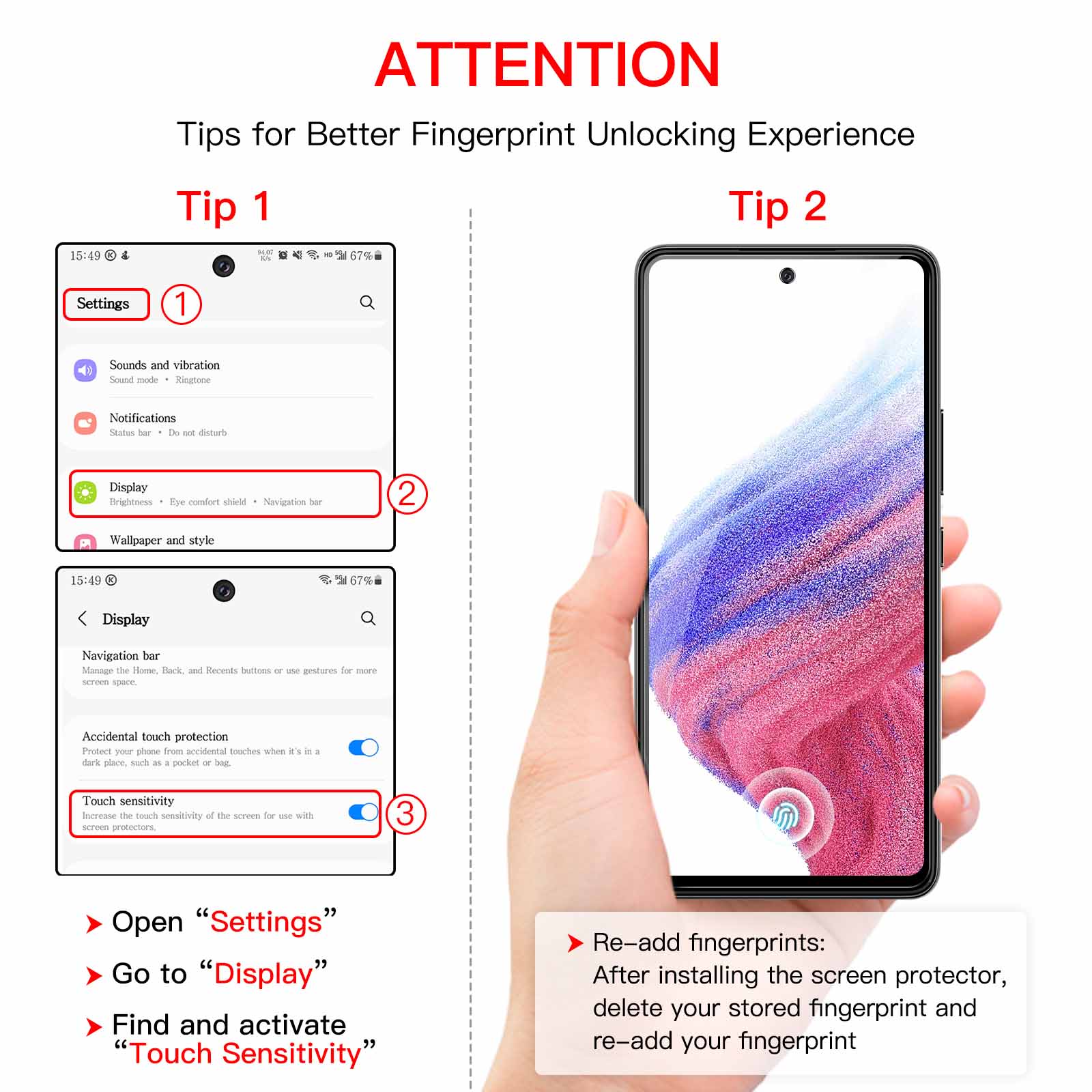 [Fingerprint Unlocked] Designed for Samsung Galaxy A53 5G 6.5-Inch. For a better unlocking experience, please go to Settings of your device to activate the Touch Sensitivity and re-enter your fingerprint after applying the film