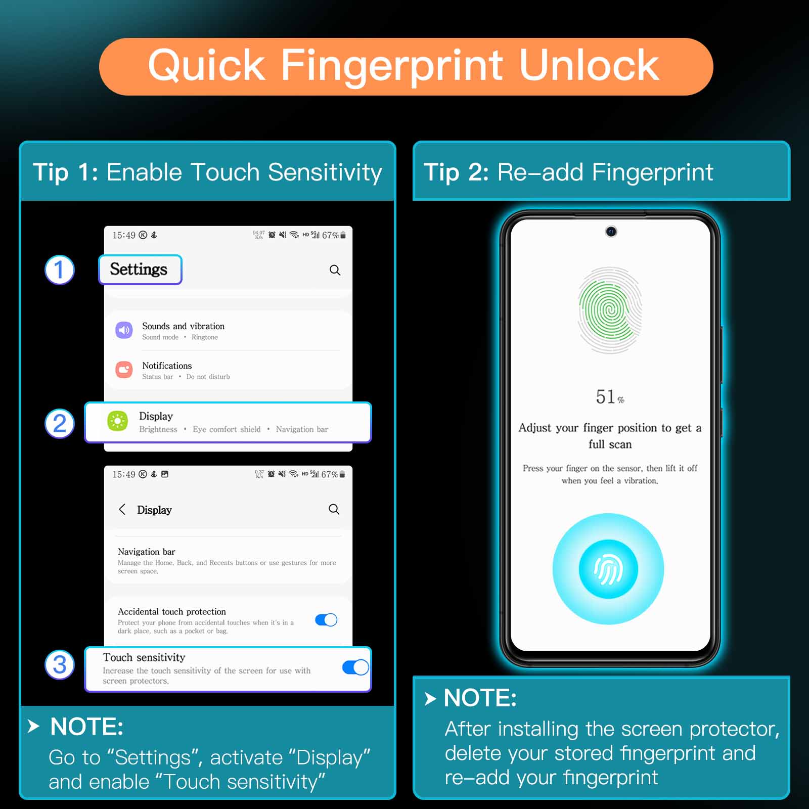 [Fingerprint Unlocked] Designed for Samsung Galaxy A54 5G 6.4-Inch. For a better unlocking experience, please go to Settings of your device to activate the Touch Sensitivity and re-enter your fingerprint after applying the film
