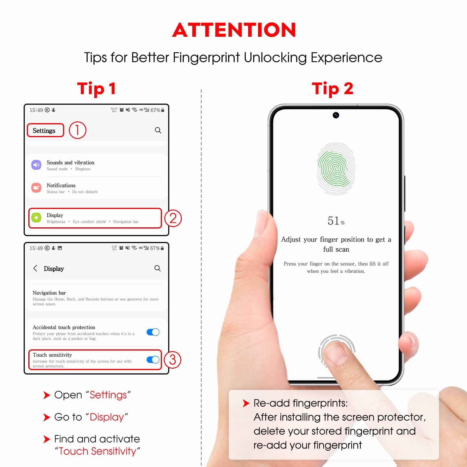 [Fingerprint Unlocked] Designed for Samsung Galaxy S22 /S22 Plus 6.6-Inch. For a better unlocking experience, please go to Settings of your device to activate the Touch Sensitivity and re-enter your fingerprint after applying the film