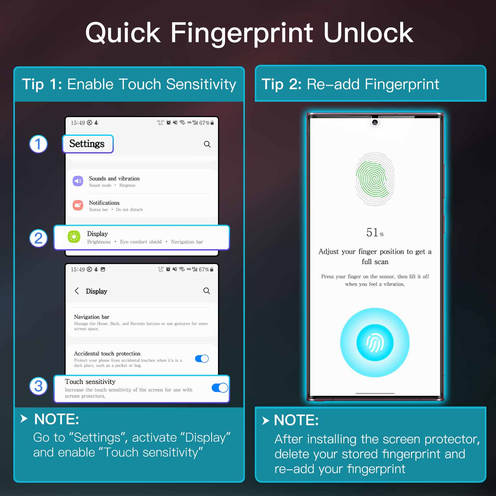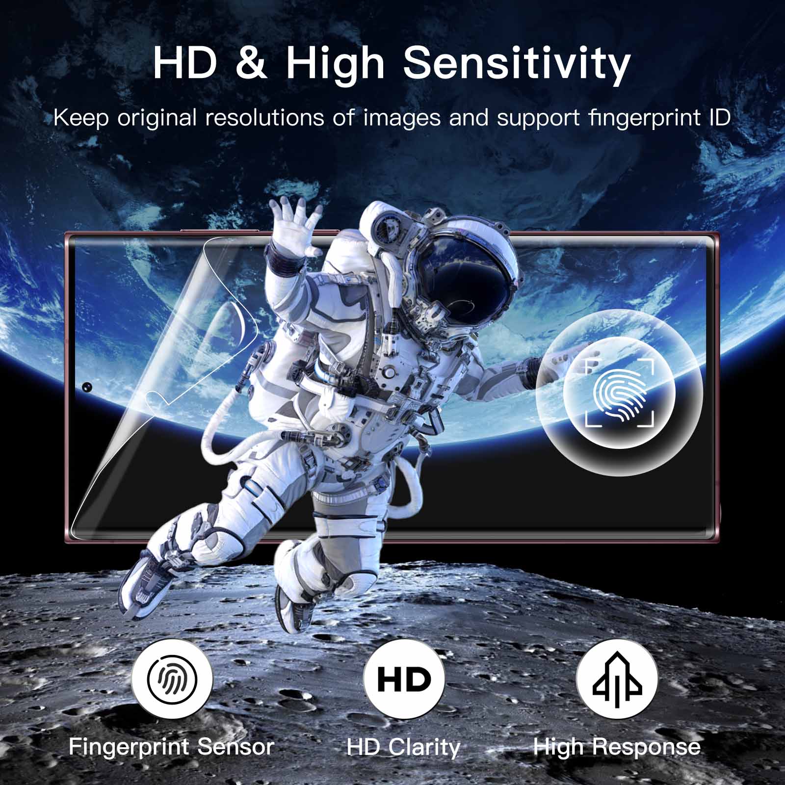 [Highly Sensitive & HD Clear] Ultra-thin film keeps the screen highly responsive and supports fingerprint unlock. In addition, guarantee vibrant color and HD clarity of your screen for an enjoyable viewing experience