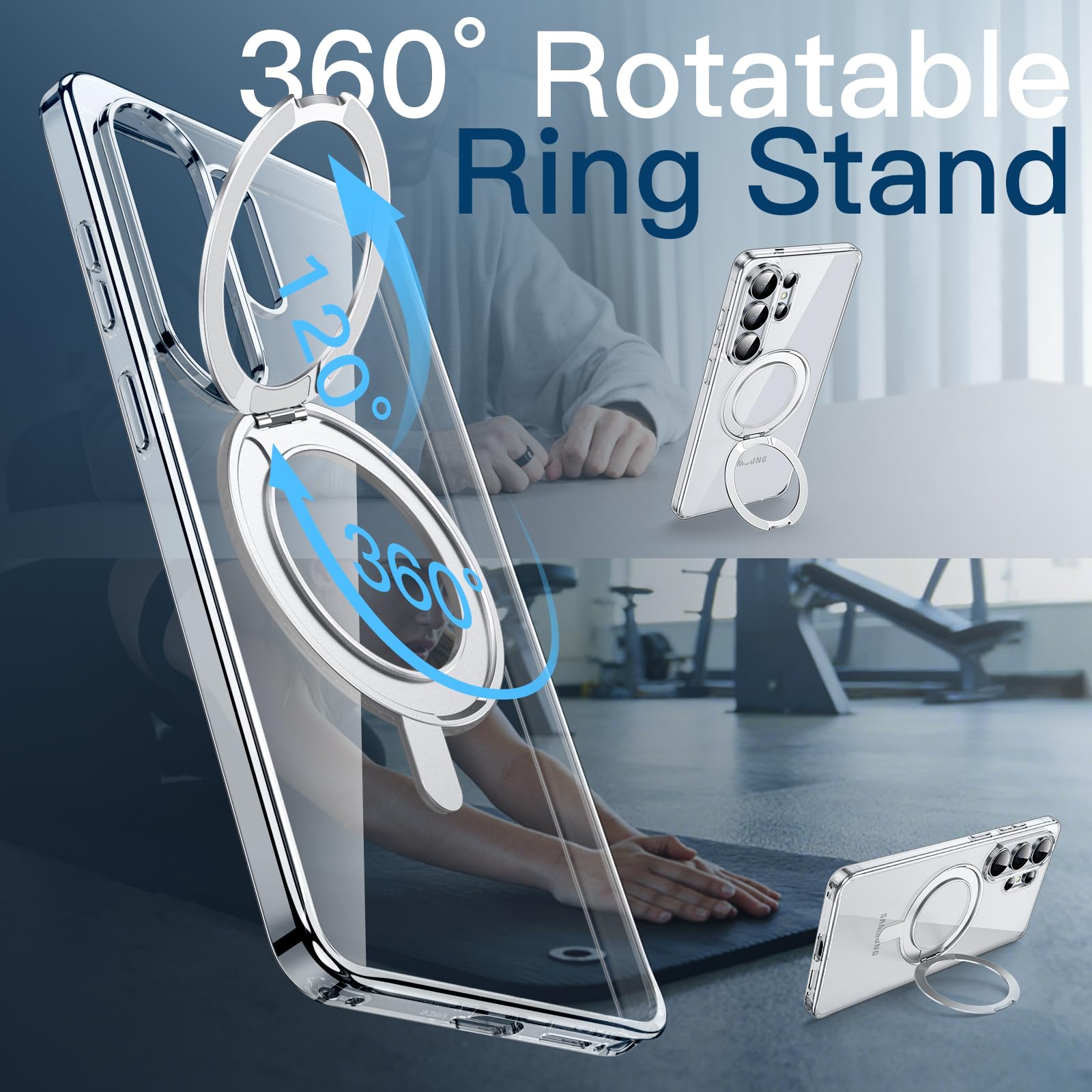 [360 Degree Rotatable Ring Stand] The case has 360 degree rotatable ring stand that prop up various vertical and horizontal positions and you can adjust the angle as per your daily needs