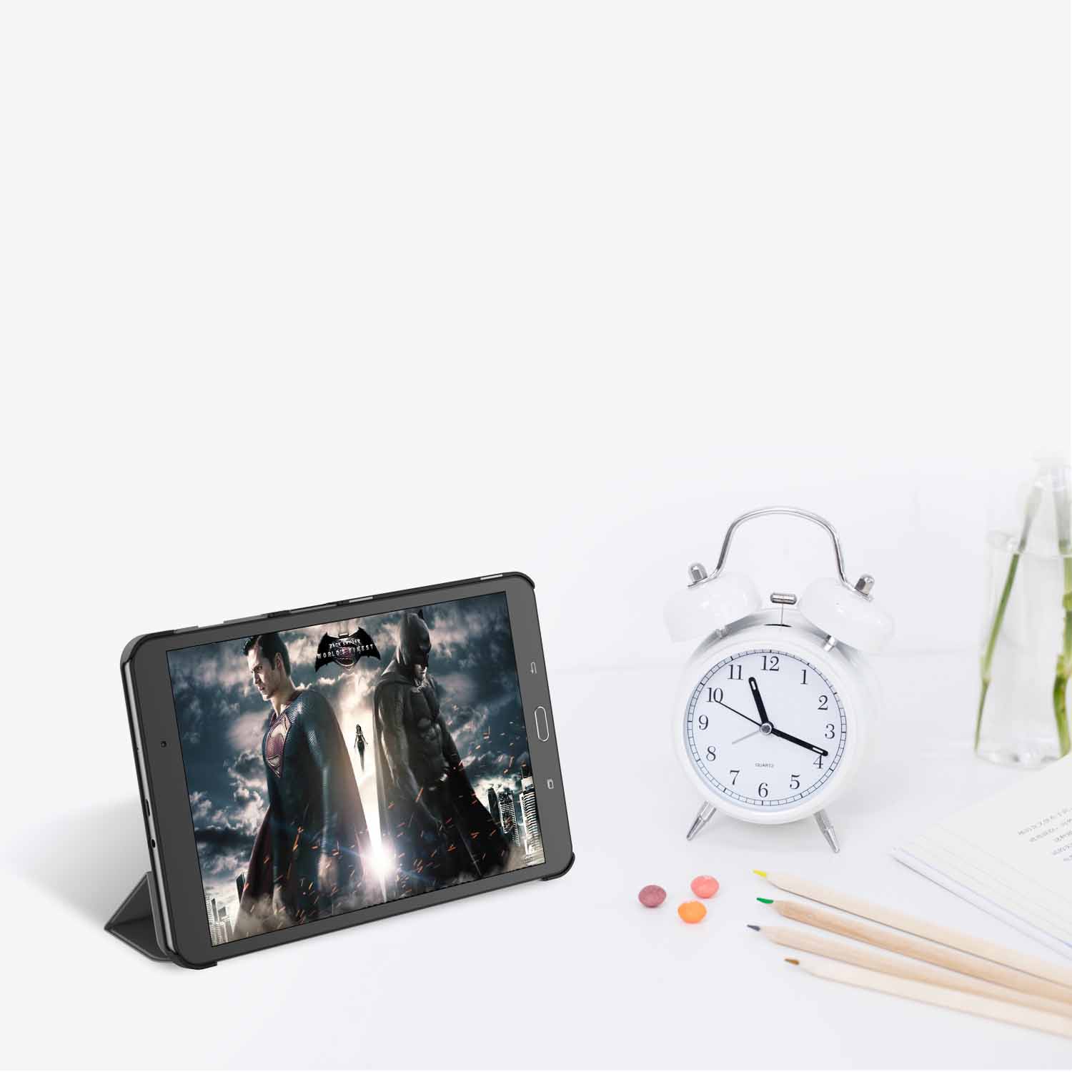 • Magnetic smart cover supports automatic sleep/wake function.The tri-fold front cover can support tablet in two standing position for viewing and typing