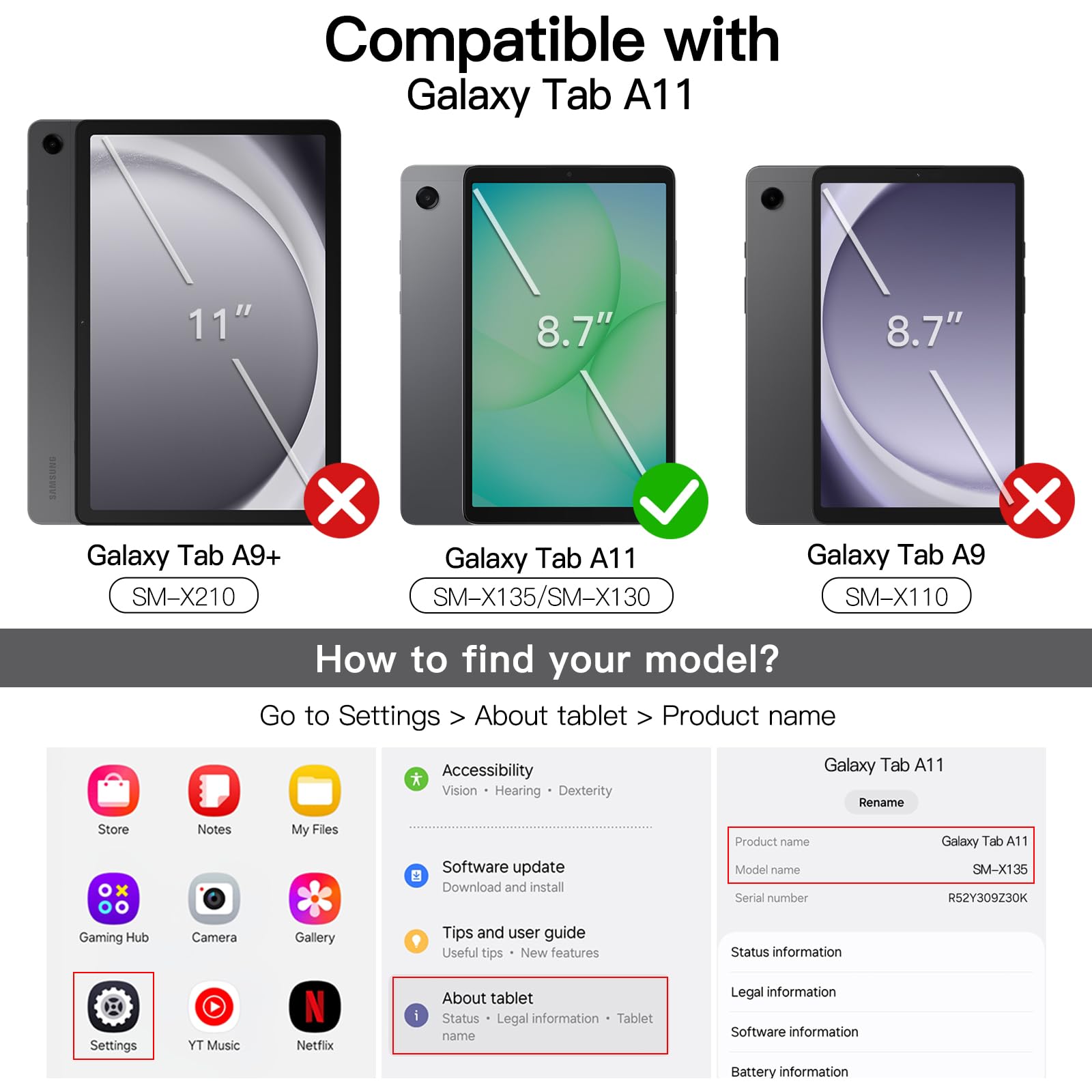 • [Compatibility] Designed for Samsung Galaxy Tab A11. Fit Models: SM-X130/SM-X135. NOTE: Not for Samsung Galaxy Tab A9. Please Go to Settings > About tablet to check your device model before purchasing