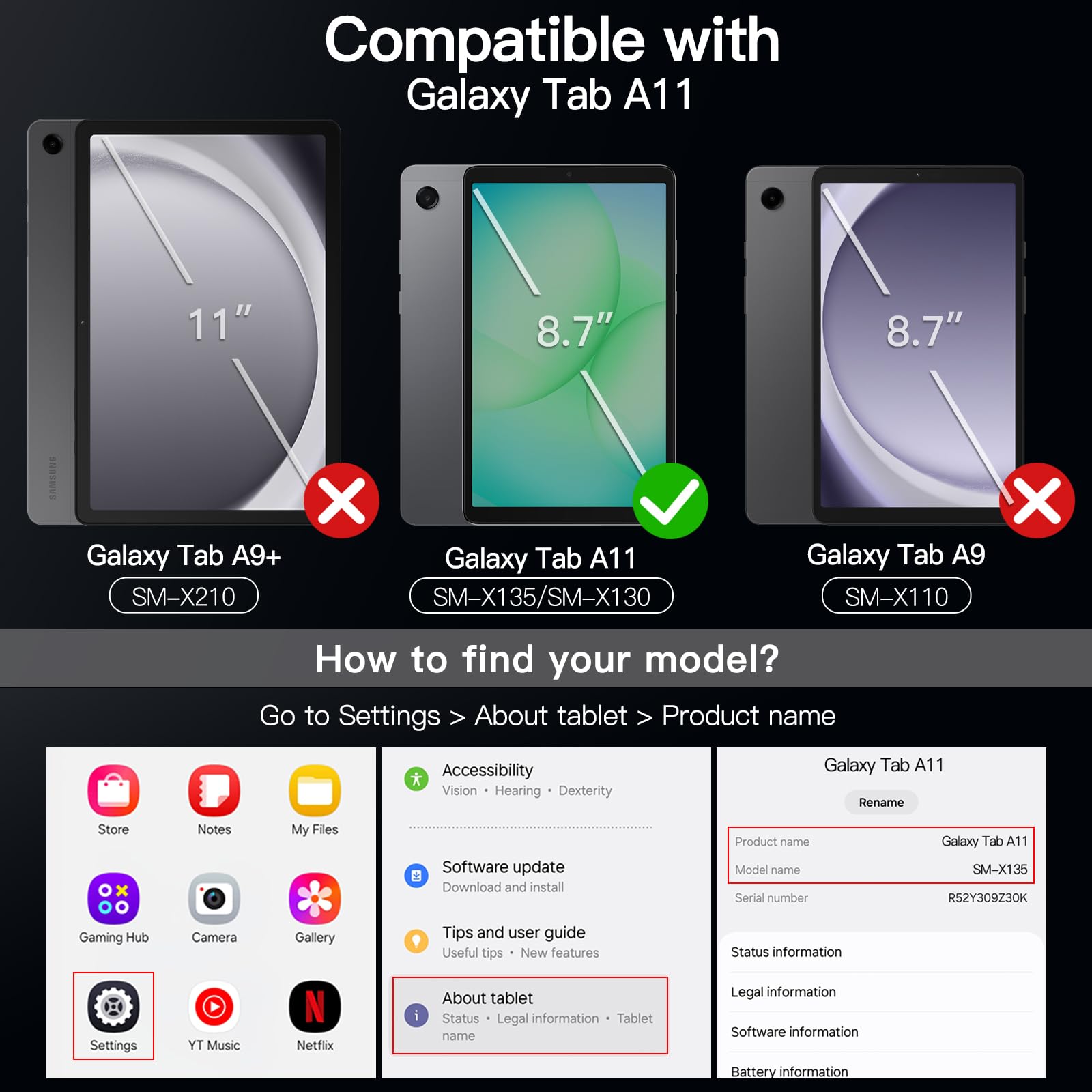 • [Perfect Compatibility] Only fit for Samsung Galaxy Tab A11. Fit Models: SM-X130/SM-X135. NOTE: Not for Samsung Galaxy Tab A9. Please Go to Settings > About tablet to check your device model before purchasing