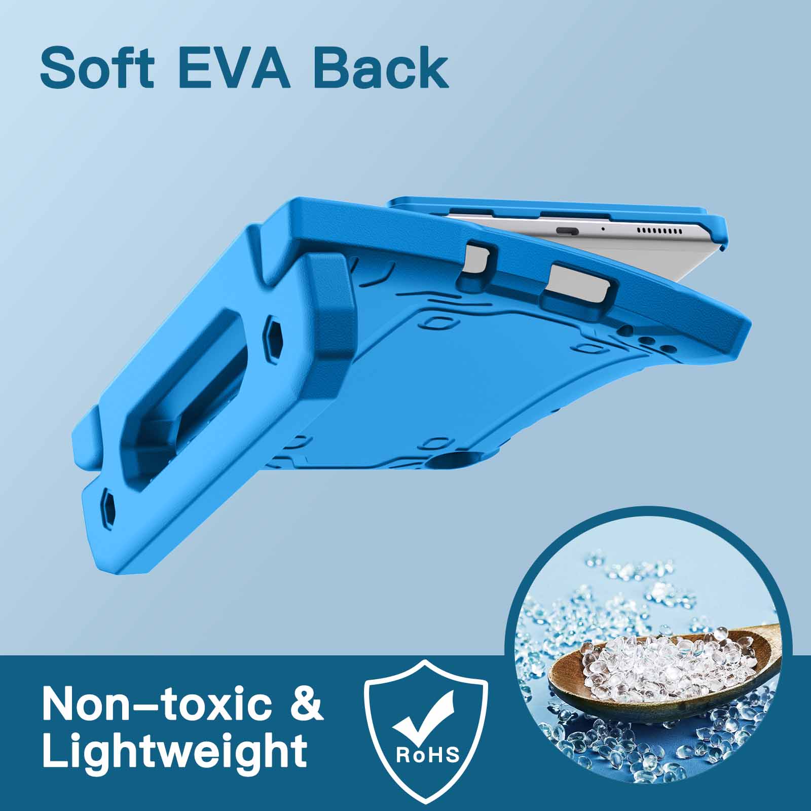 • [Versatile Stand] Designed with a kid-friendly handle with anti-slip texture. It is easy for kids to carry around and fold it back to convert into a sturdy stand for hands-free viewing and comfortable typing