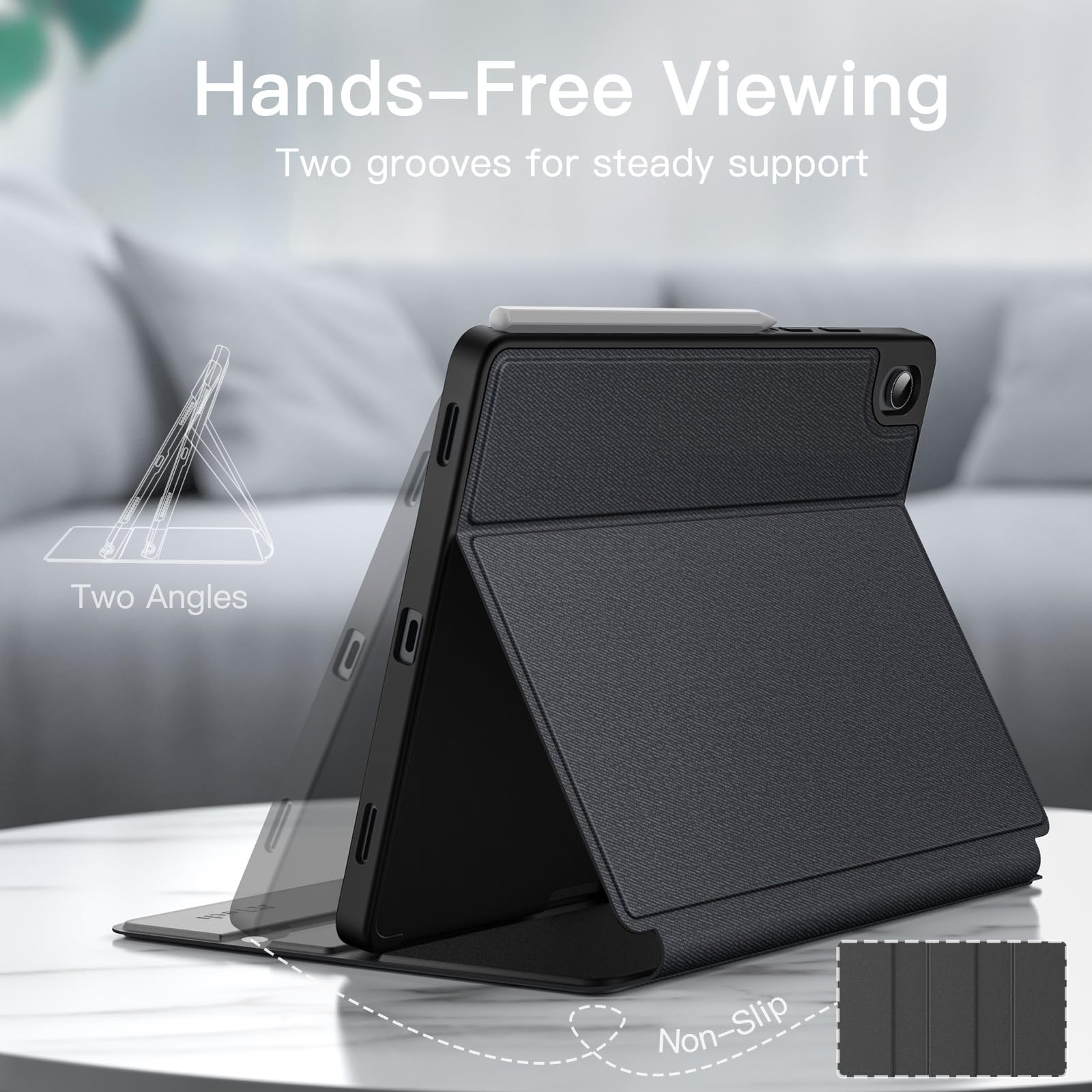 [Multi Standing Positions] The two anti-slip grooves of the front cover can prop up your device in different viewing angles. Moreover, precisely aligned cutouts make it easier to use the camera, speaker, buttons and other features