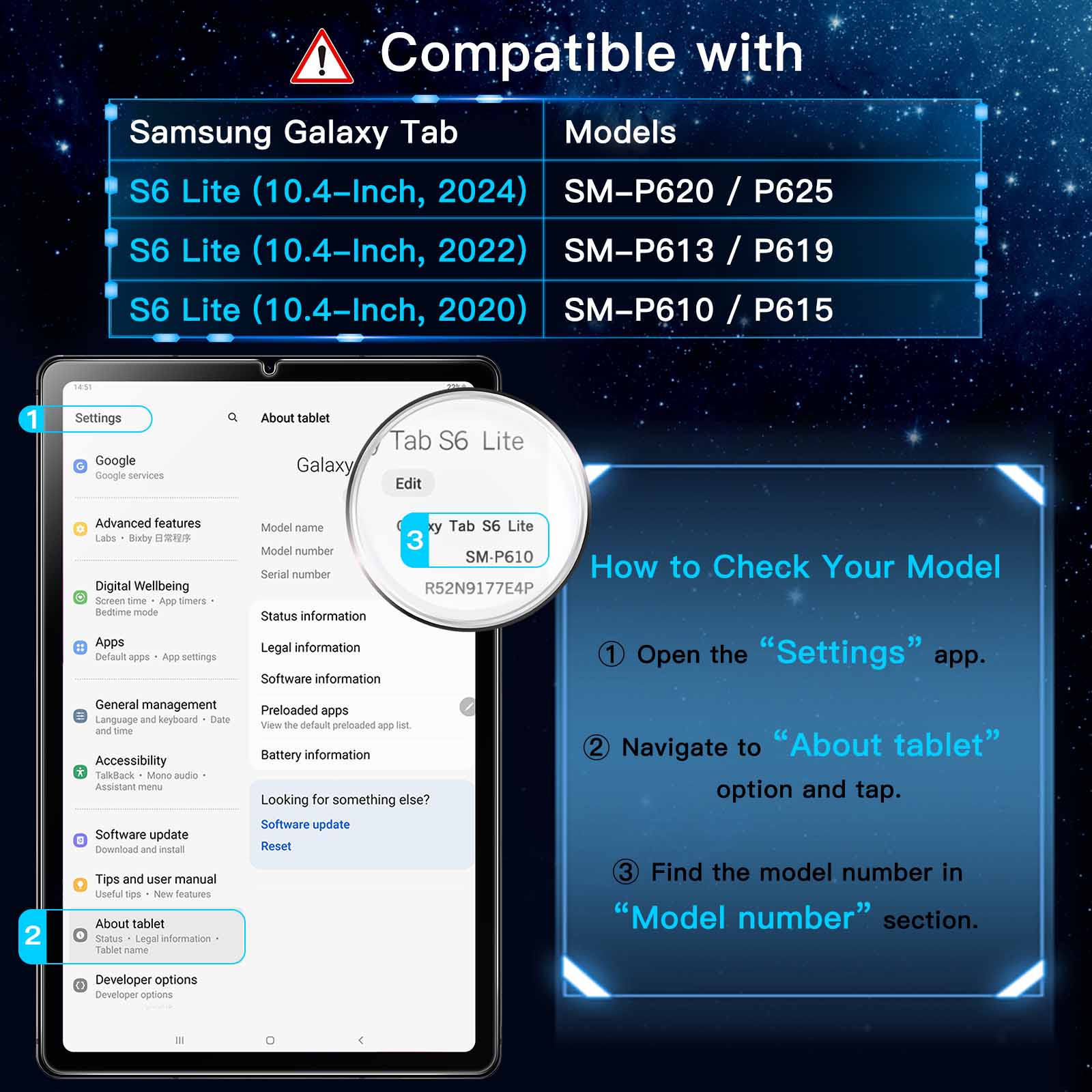 [Compatibility] Exclusively fit Samsung Galaxy Tab S6 Lite 2022/2020 Model 10.4-Inch. Fit Galaxy Tab Models: SM-P610 / SM-P613 / SM-P615 / SM-P619. Please double check the model number before purchasing