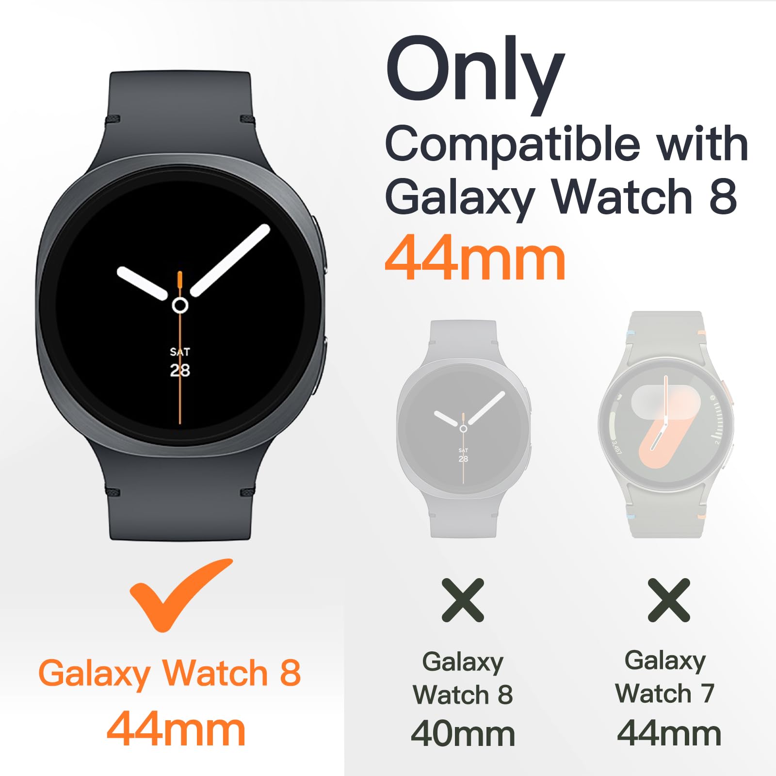 [Perfect Fit] Compatible with Samsung Galaxy Watch 8 44mm. NOTE: Not for Samsung Galaxy Watch 7/6. Please check the back of your device to find the watch model. Precise cutouts allow you to access all features and buttons easily