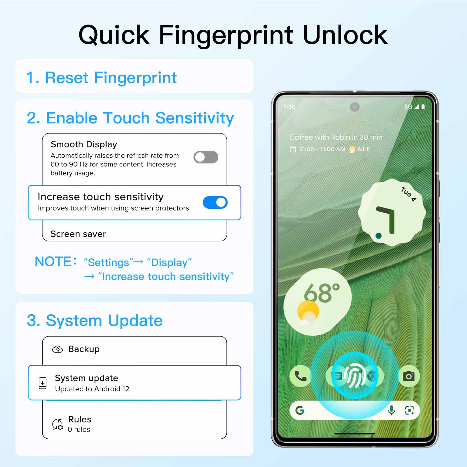 [Fingerprint Unlocked] Designed for Google Pixel 7. For a better unlocking experience, please go to Settings of your device to activate the Touch Sensitivity and re-enter your fingerprint after applying the film