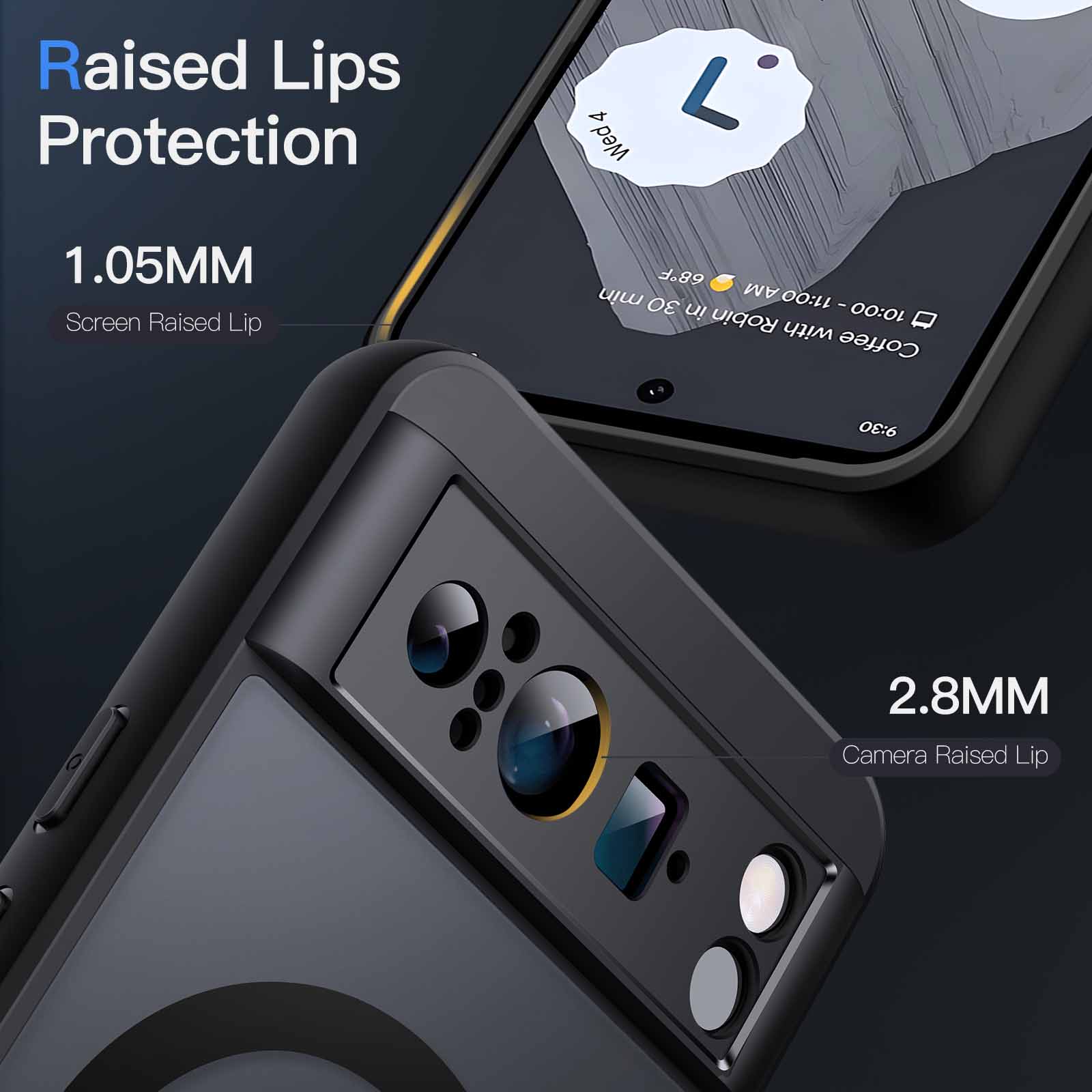 [Raised Lips Protection] There are lifted edges around the screen and camera, so that this magnetic phone case can keep them scratch-free when being put faced down