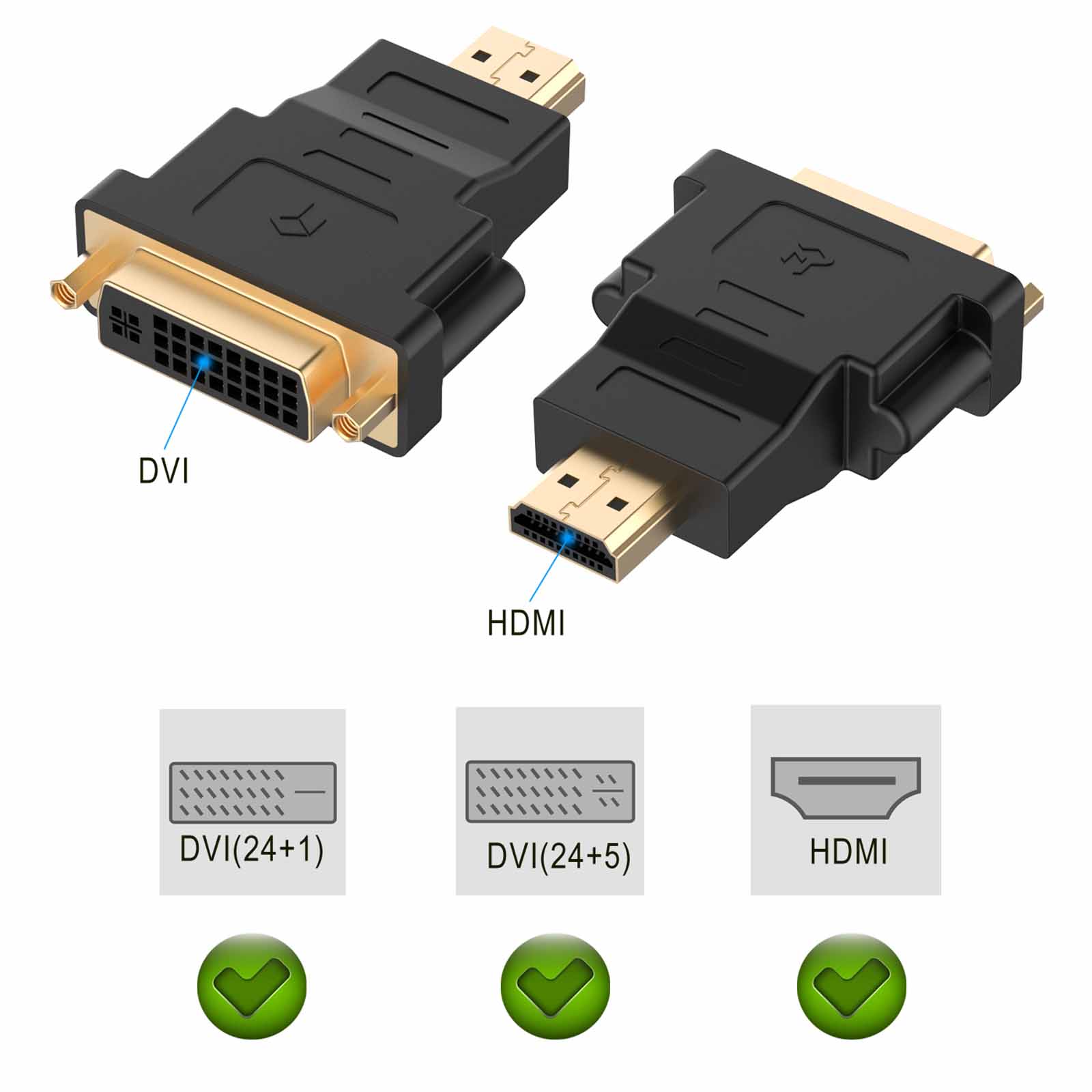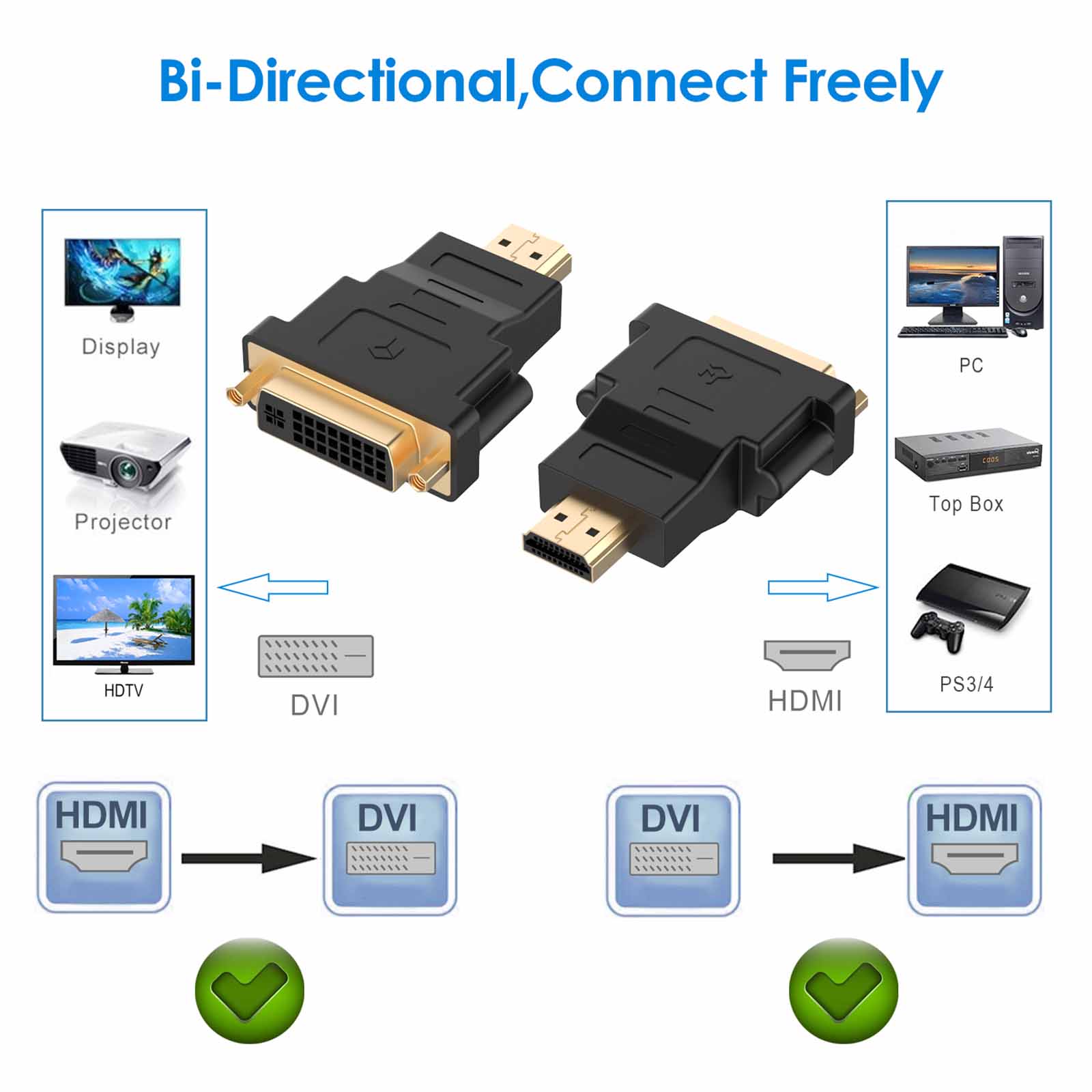 • The bi-directional HDMI-DVI adapter is a great solution for connecting from a computer with DVI port to a monitor, HDTV, or projector with HDMI port, or from a computer, Blu-ray player, TV box, or game console with HDMI port to a monitor with DVI port. A DVI cable (sold separately) is required