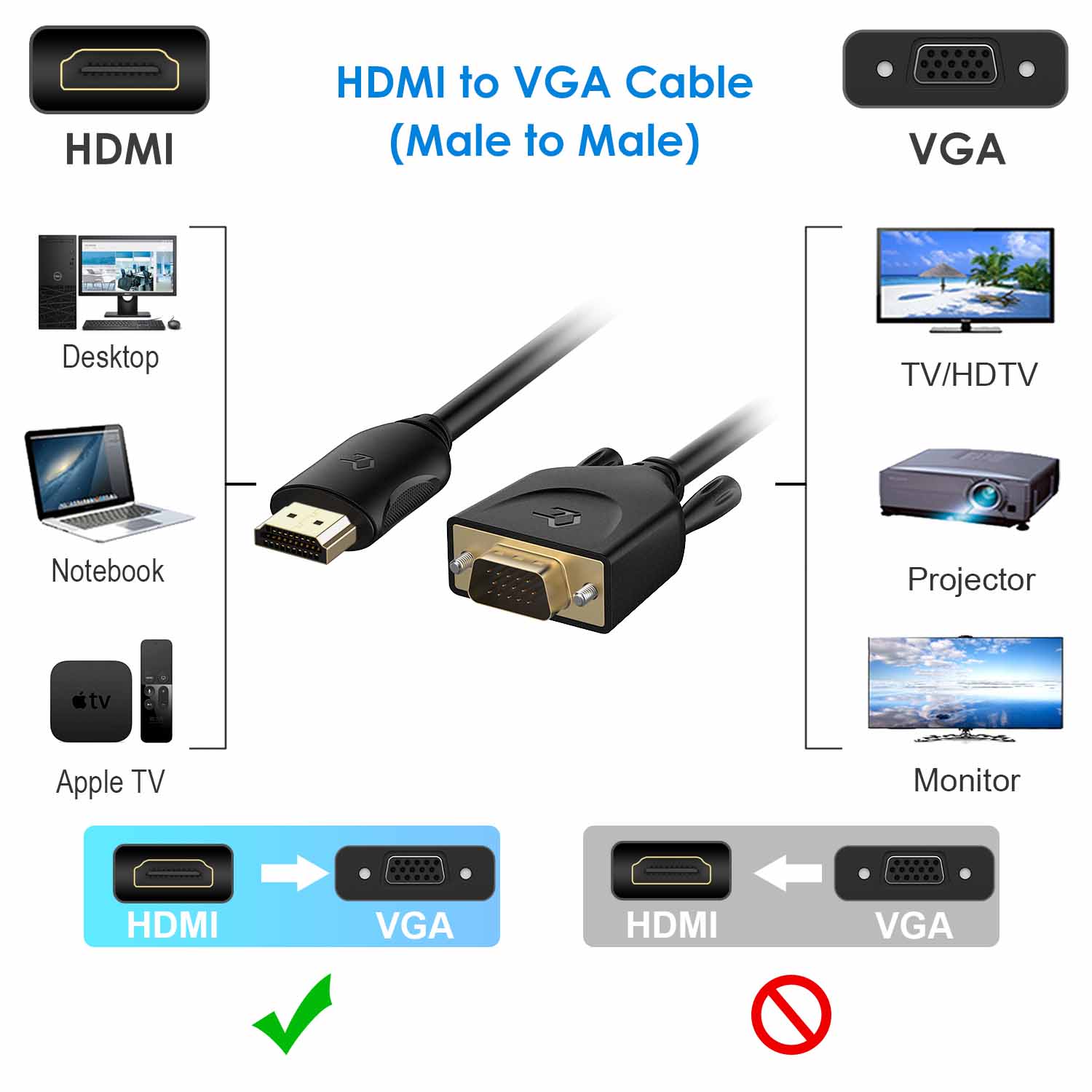 Connects computer, desktop, laptop, or other devices with HDMI port to a monitor, projector, HDTV, or other devices with VGA port. NOTE: It’s NOT a bi-directional converter and CANNOT transmit signals from VGA to HDMI