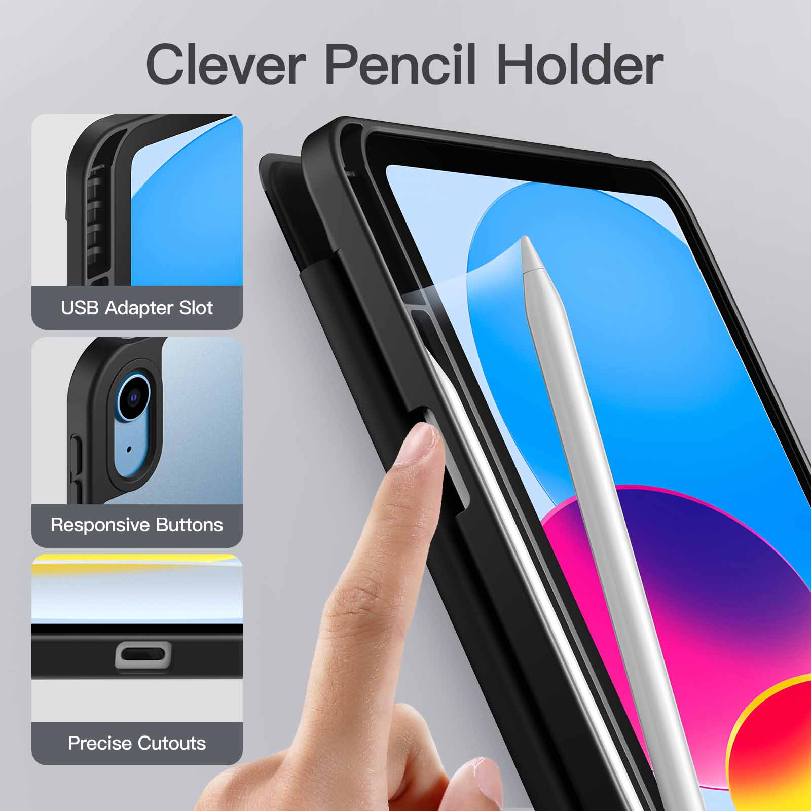 • [Built-in Pencil Holder] Easily store and remove your Pencil. A special slot for placing the USB adapter. Portable to carry them with your device and allow you to grab them effortlessly (Pencil & USB Adapter NOT Included)