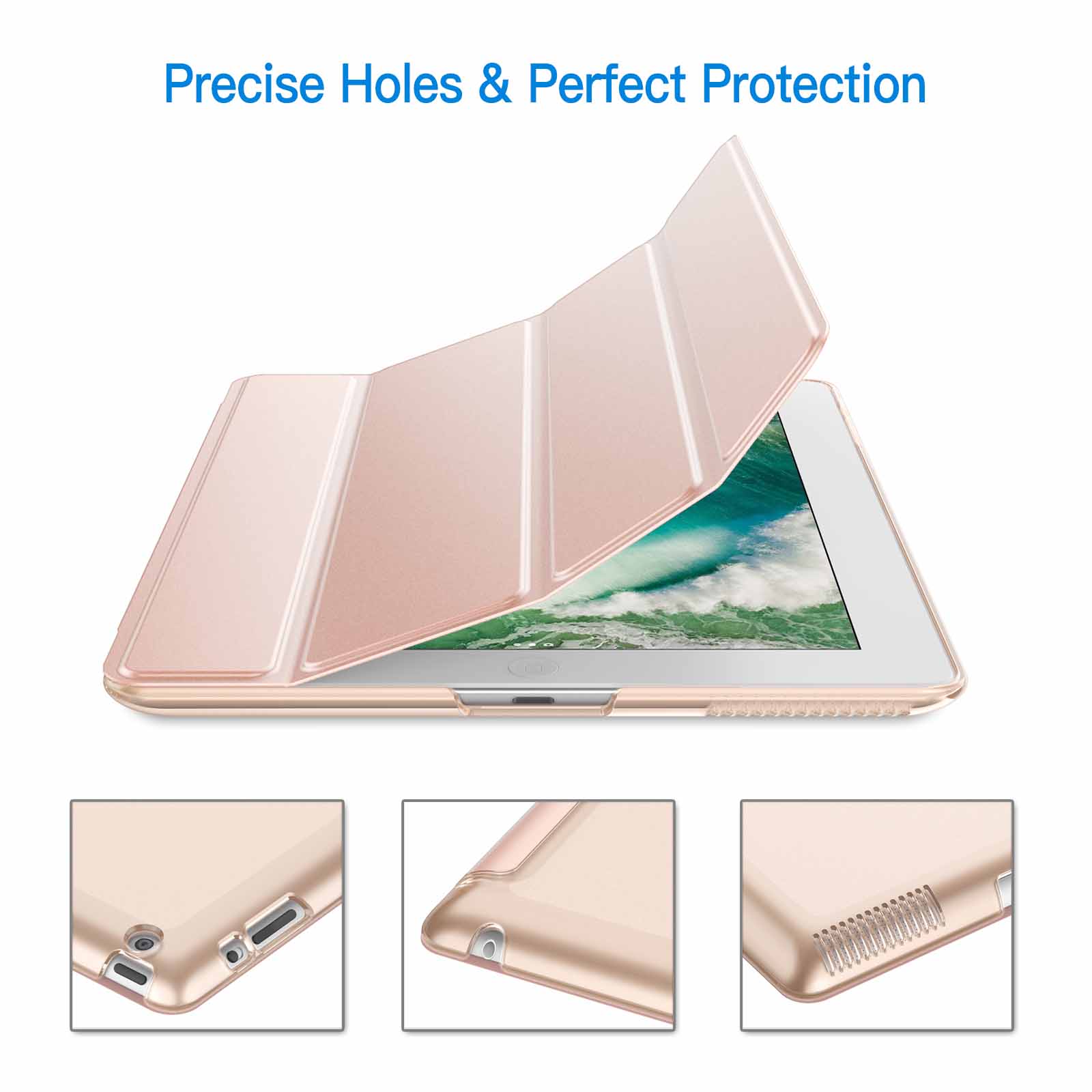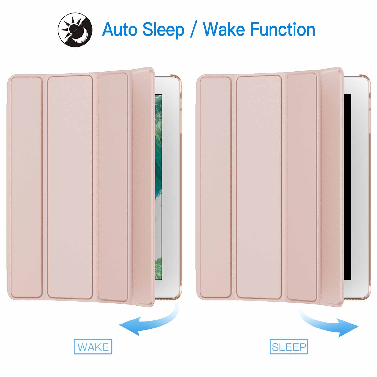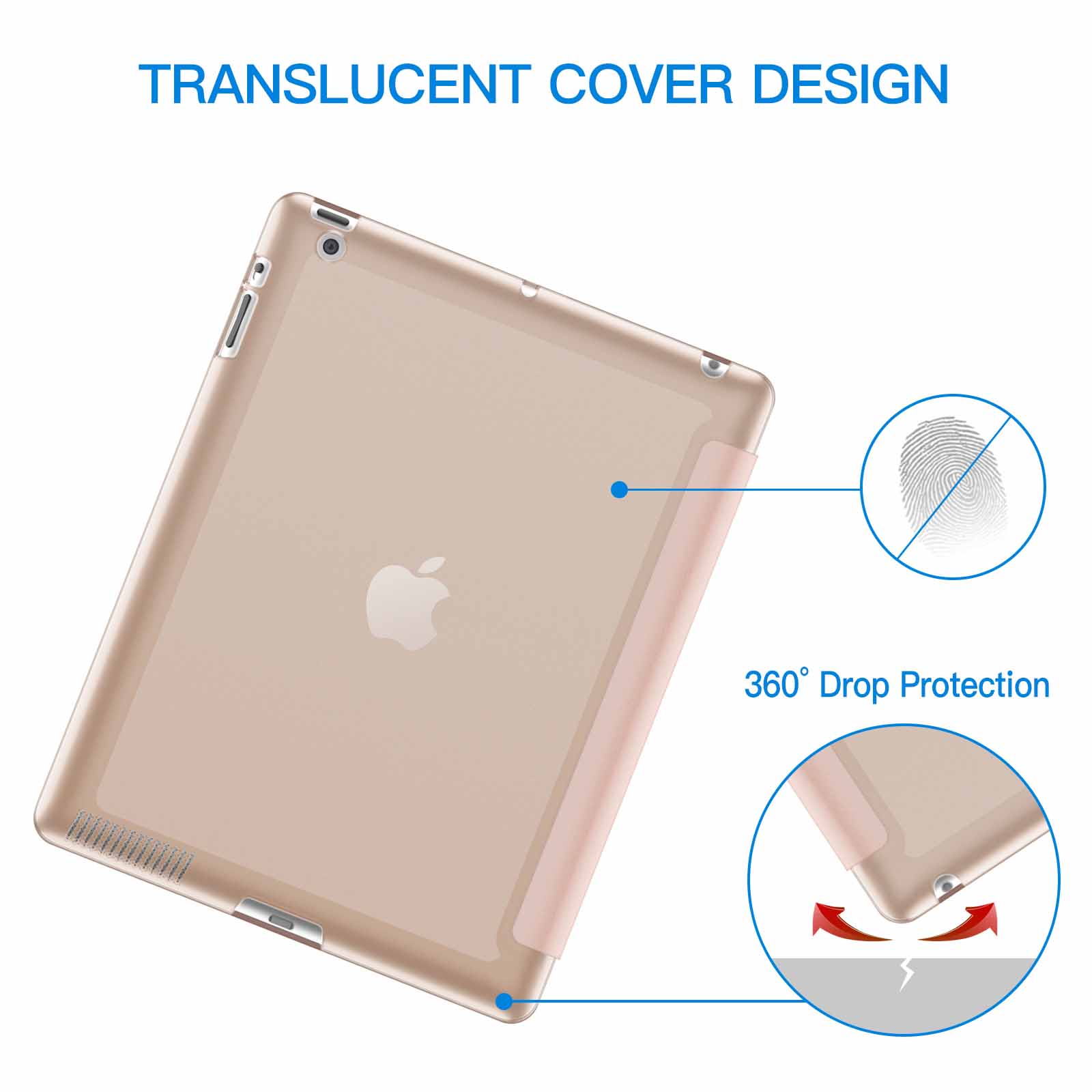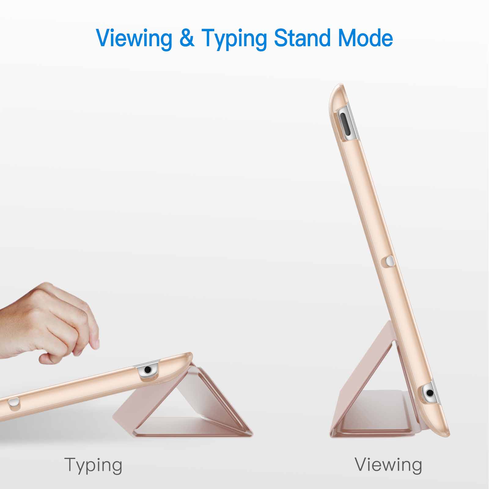 - Magnetic smart cover supports automatic sleep/wake function.The quad-fold front cover can support iPad in two standing position for viewing and typing