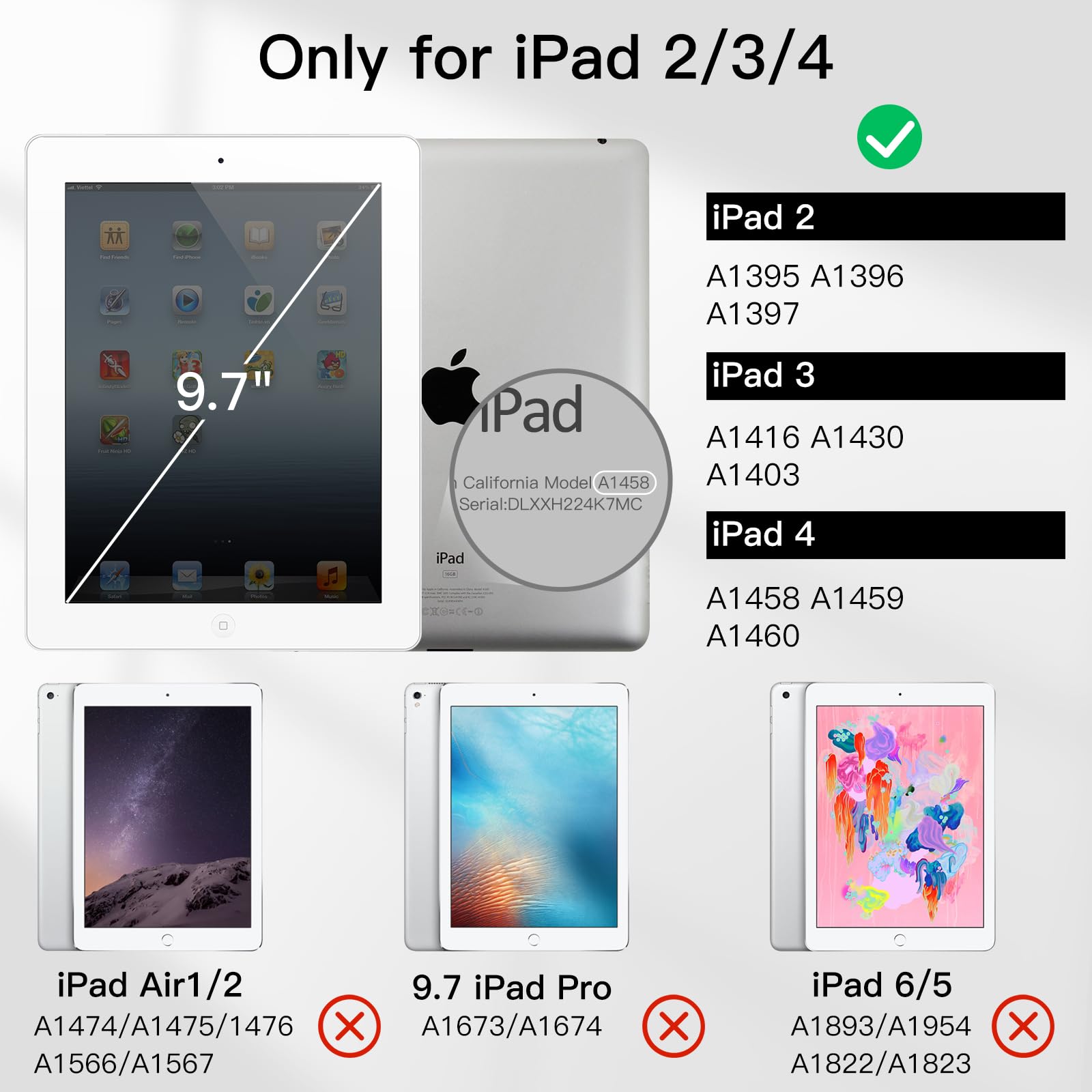 - Designed for iPad 2/3/4. NOT for later iPad such as iPad mini, iPad Air, iPad Pro, NOT for newest 2017 iPad 9.7 inch. Fit iPad Models: A1395/A1396/A1397/A1416/A1430/A1403/A1458/A1459/A1460. Please check back bottom of your iPad to find the model number