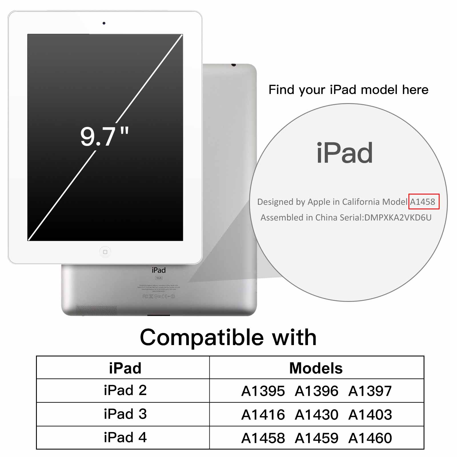 [Compatibility] Designed for iPad 2/3/4. Fit iPad Models: A1395 A1396 A1397 A1416 A1430 A1403 A1458 A1459 A1460. Please check the back bottom of your iPad to find the model number