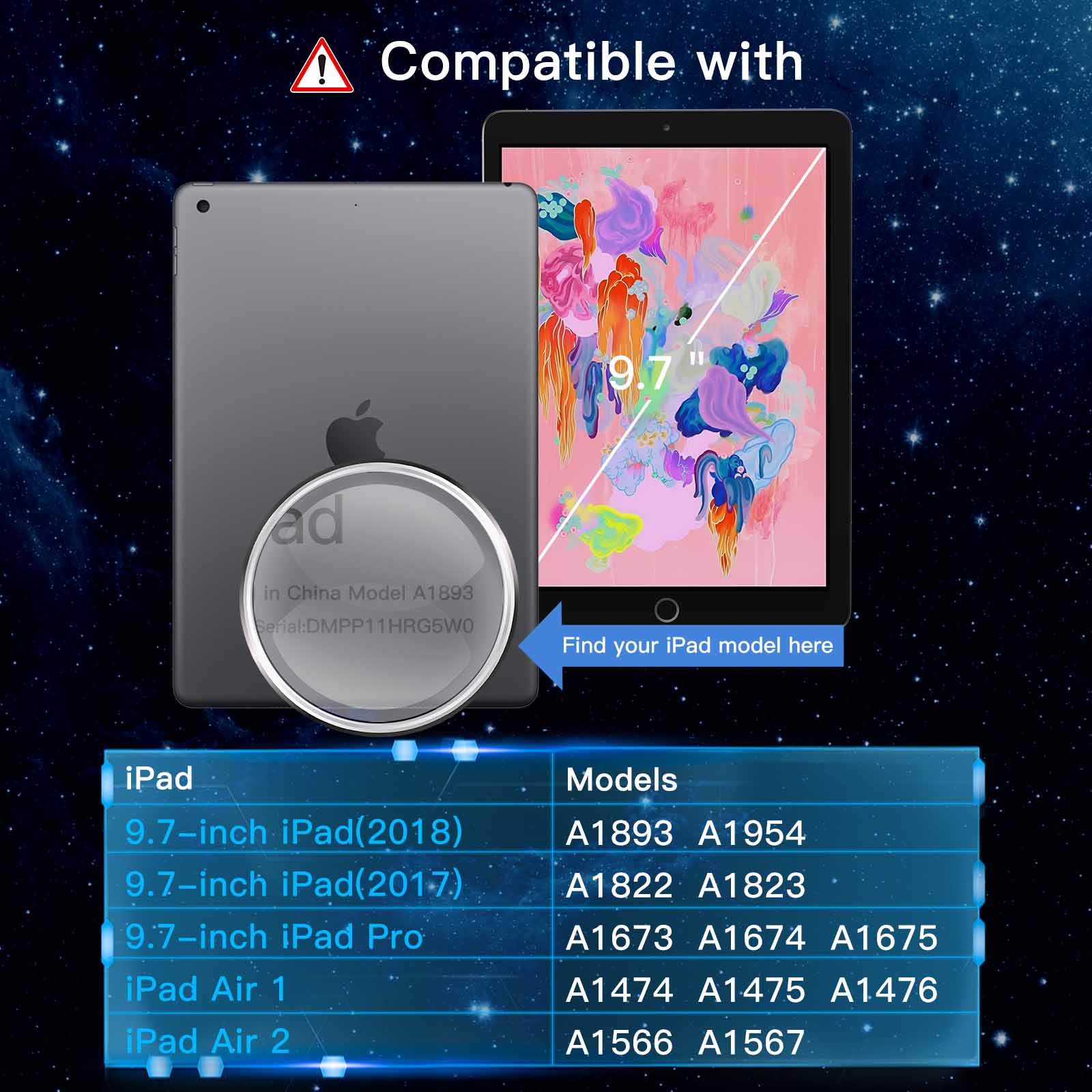 [Compatibility] Perfectly designed for iPad Air 1, iPad Air 2, iPad Pro 9.7, iPad 9.7-inch (2018/2017 model, iPad 6 / iPad 5). Fit iPad models: A1474 / A1475 / A1476 / A1566 / A1567 / A1822 / A1823 / A1673 / A1674 / A1675 / A1893 / A1954