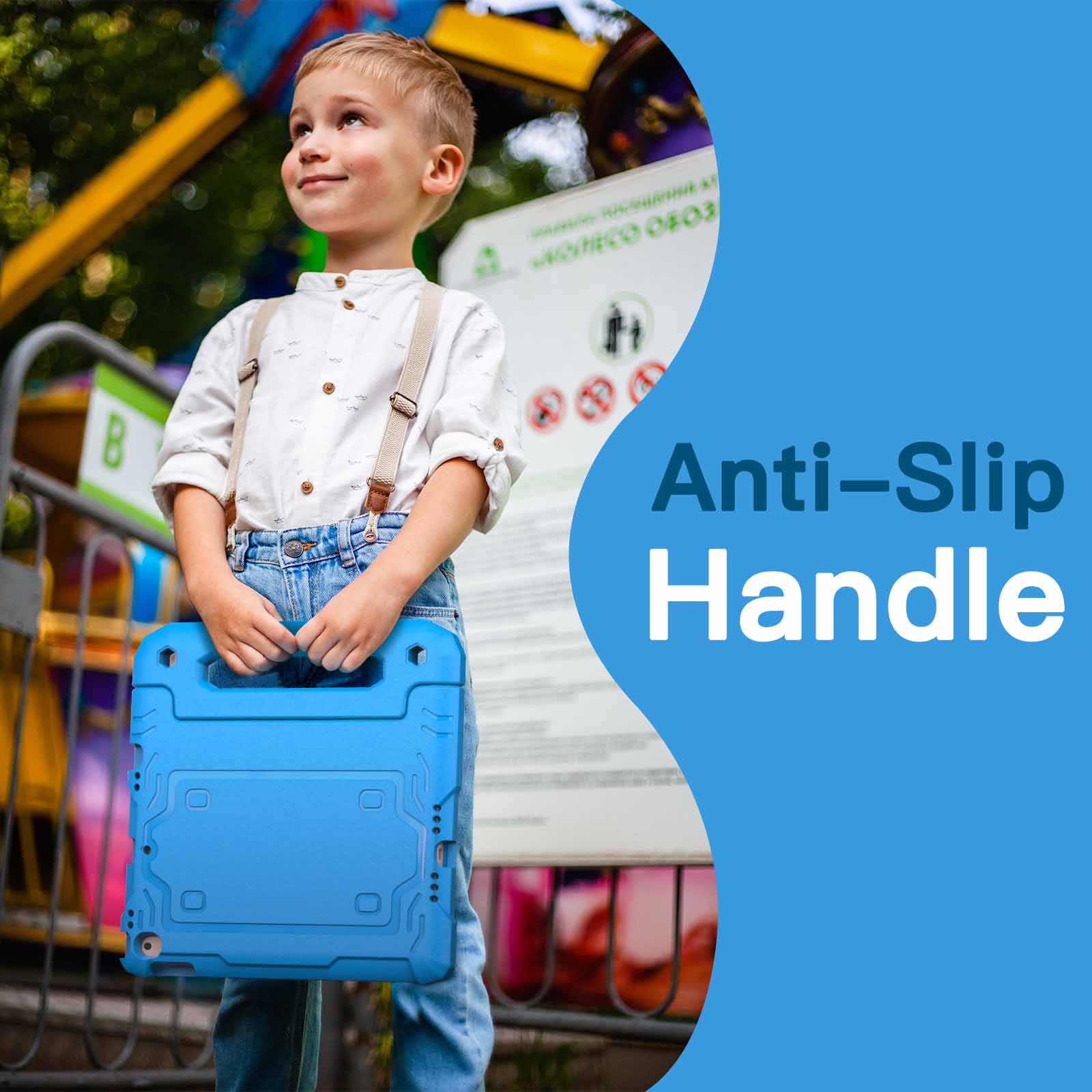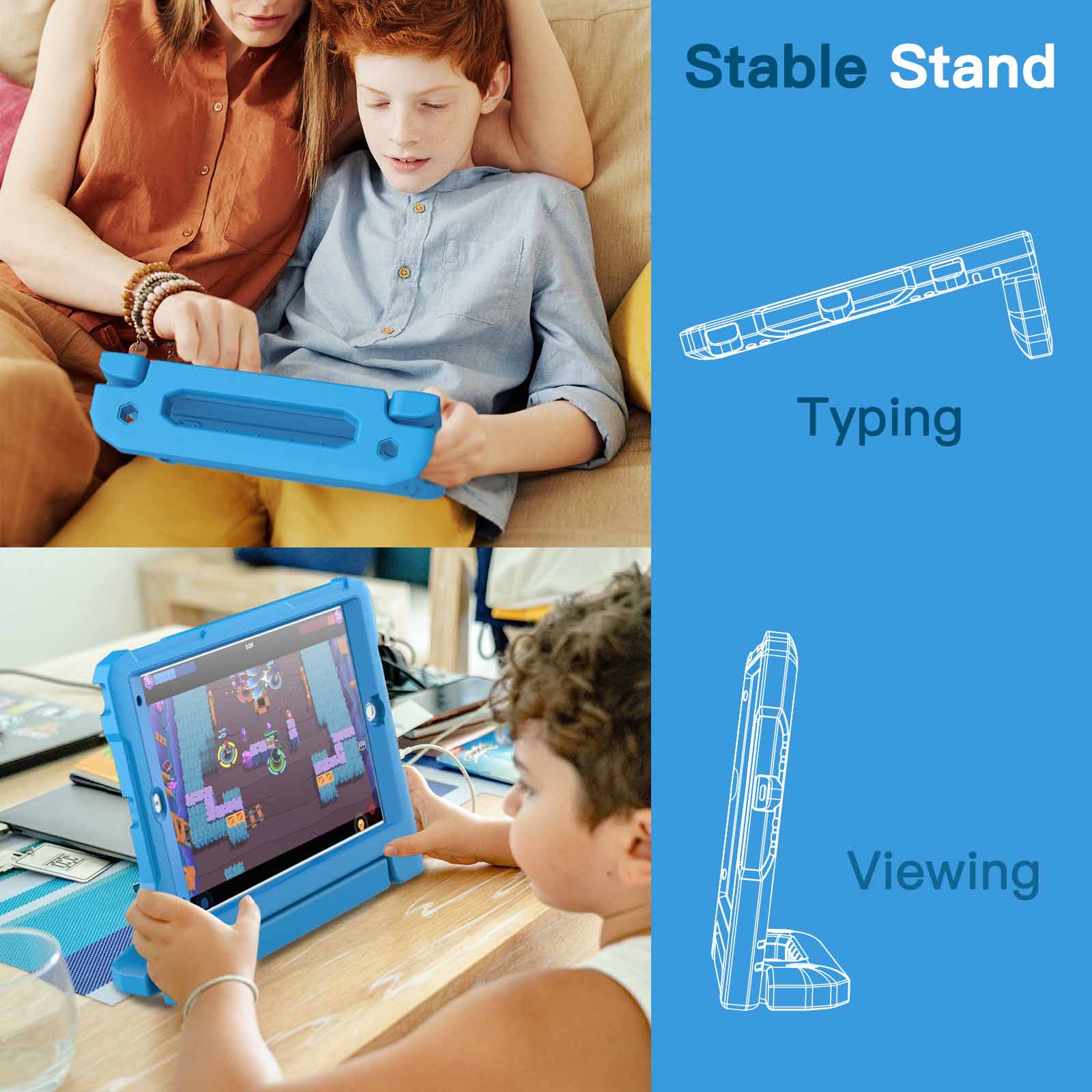 [Versatile Stand] Designed with a kid-friendly handle with anti-slip texture. It is easy for kids to carry around and fold it back to convert into a sturdy stand for hands-free viewing and comfortable typing