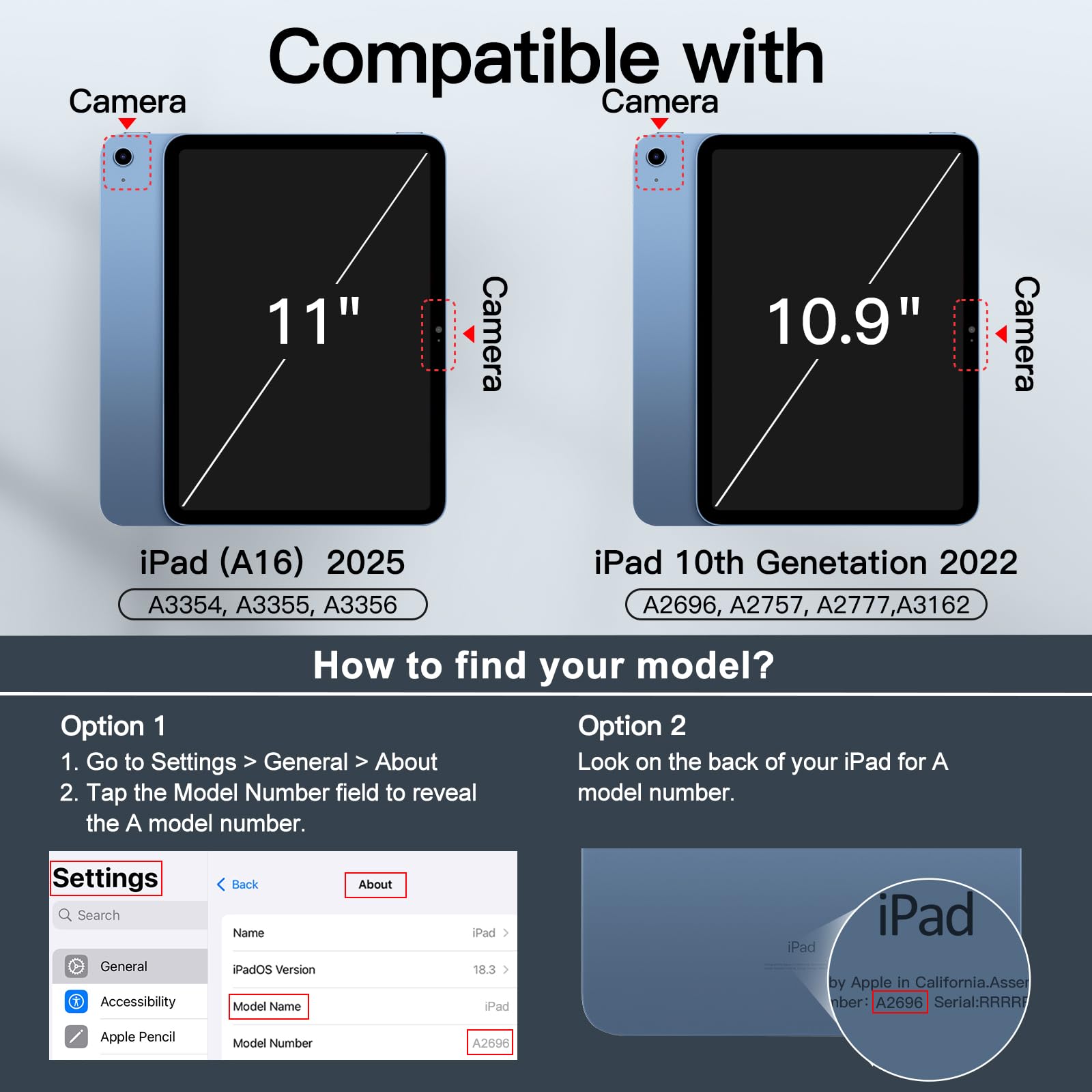• [Compatibility] Designed for iPad (A16) 11th/10th generation (2025/2022). Fits iPad Models: A3354 / A3355 / A3356 / A2696 / A2757 / A2777 / A3162. Please Go to Settings > General > About, then tap the Model Number field to reveal the A model number