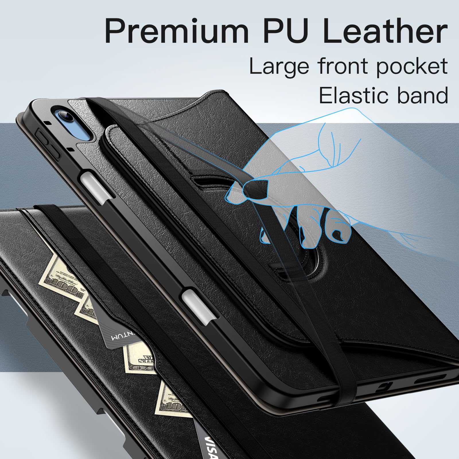 • [Multi-Function] A large front pocket to store cards, cash, notes and so on. Also come with an exterior elastic strap to fix iPad tightly to the case, and the adjustable inner hand strap helps you firmly hold your iPad