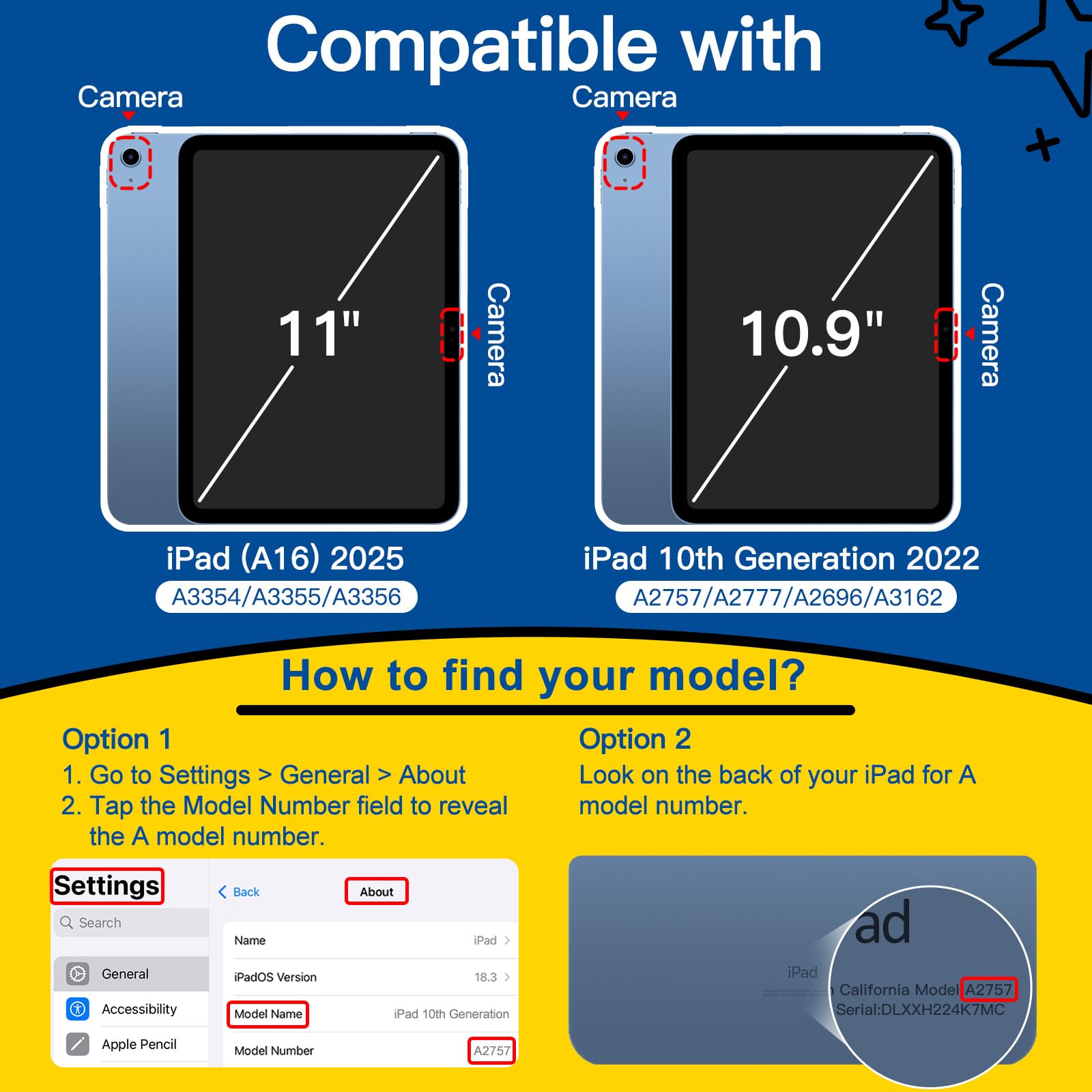 [Compatibility] Perfectly designed for iPad (A16) 11th/10th generation (2025/2022). Fit models: A3354 / A3355 / A3356 / A2696 / A2757 / A2777 / A3162. Please Go to Settings > General > About, then tap the Model Number field to reveal the A model number