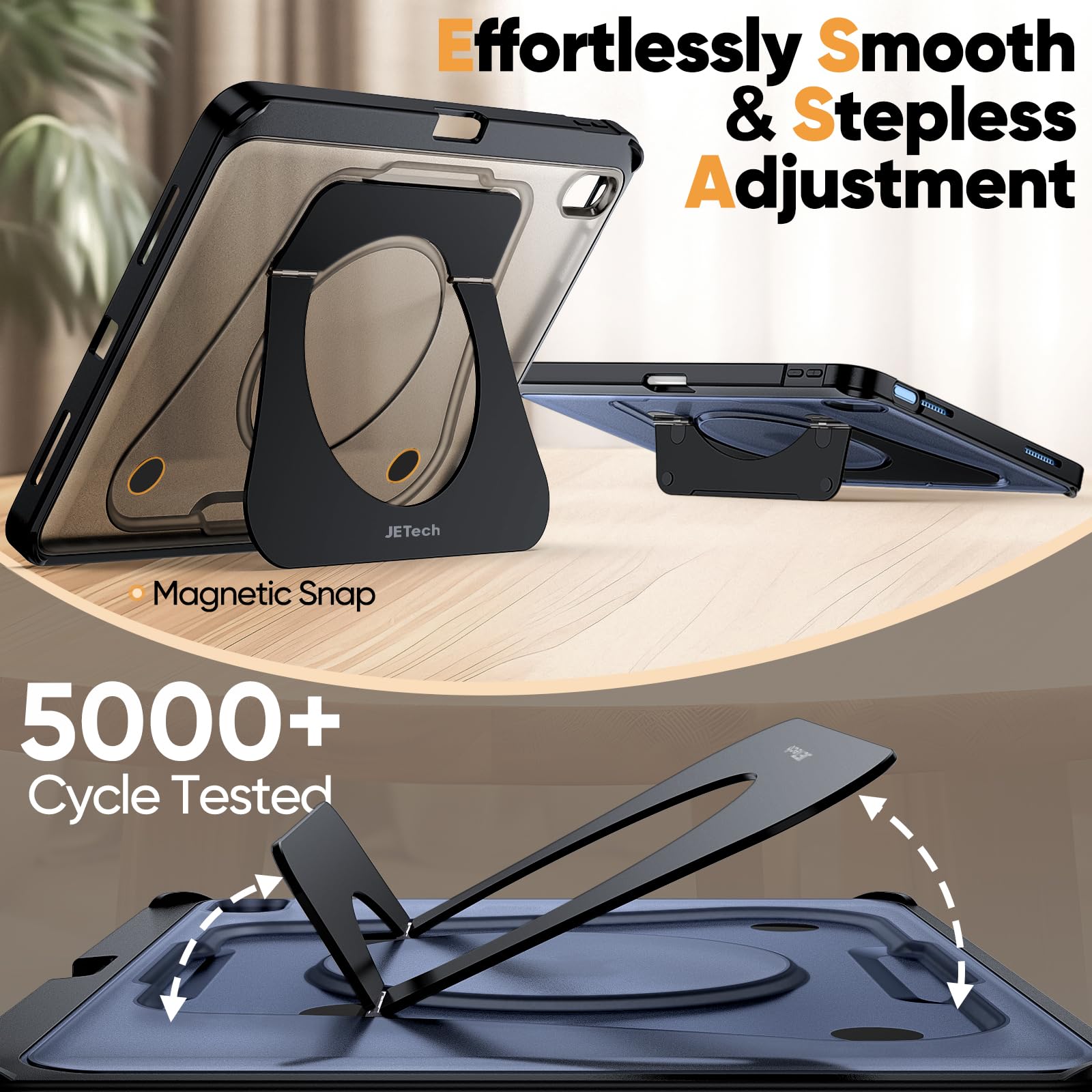• [Sturdy & Durable] Constructed with a rigid aluminum alloy stand and precision hinges, the stand delivers rock-solid stability even after 5,000 open-close cycles. Meanwhile, its unique magnetic design keeps the larger stand securely in place, preventing popping up over time