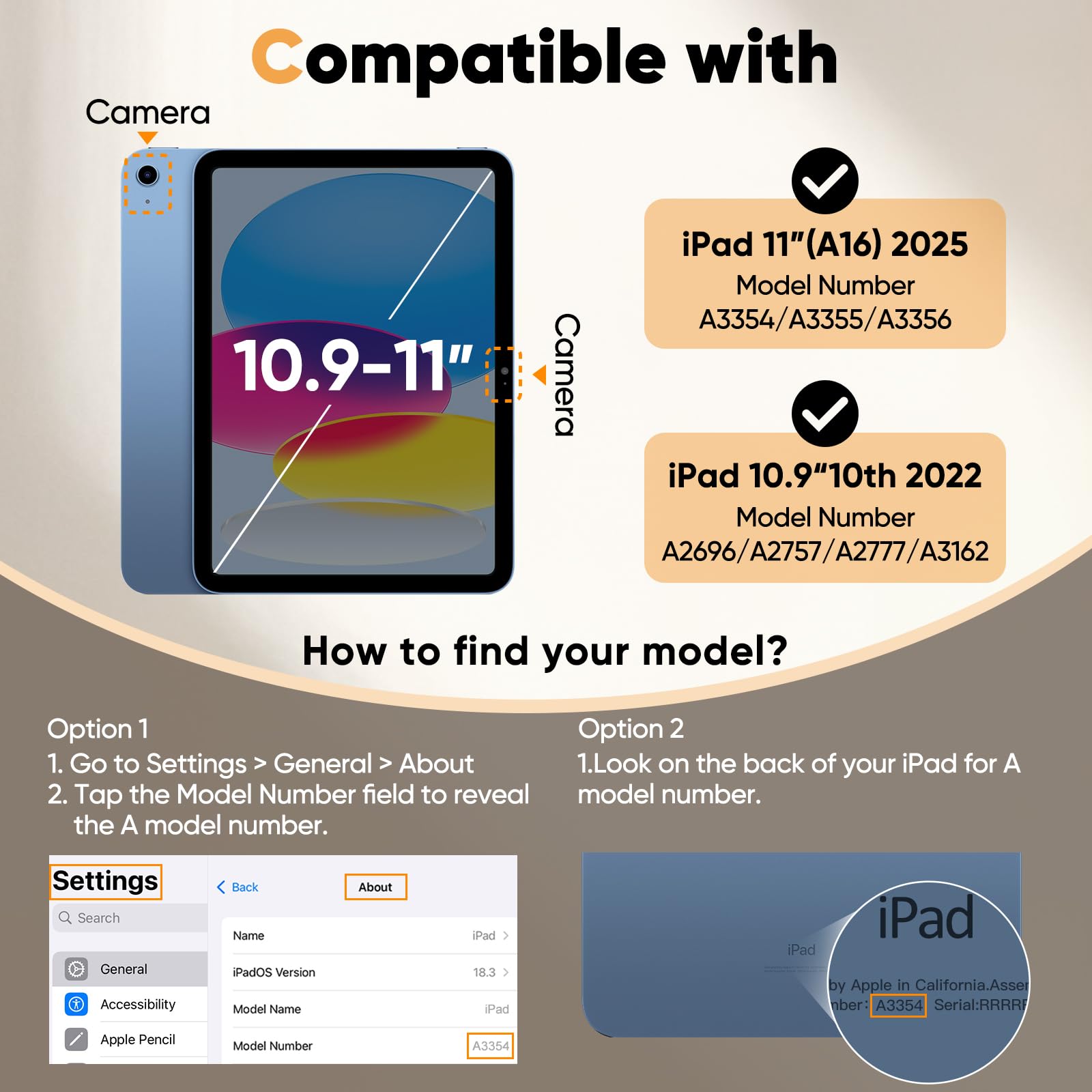 • [Compatibility] Designed for iPad (A16) 11th/10th generation (2025/2022). Fit iPad Models: A3354 / A3355 / A3356 / A2696 / A2757 / A2777 / A3162. Please Go to Settings > General > About, then tap the Model Number field to reveal the A model number