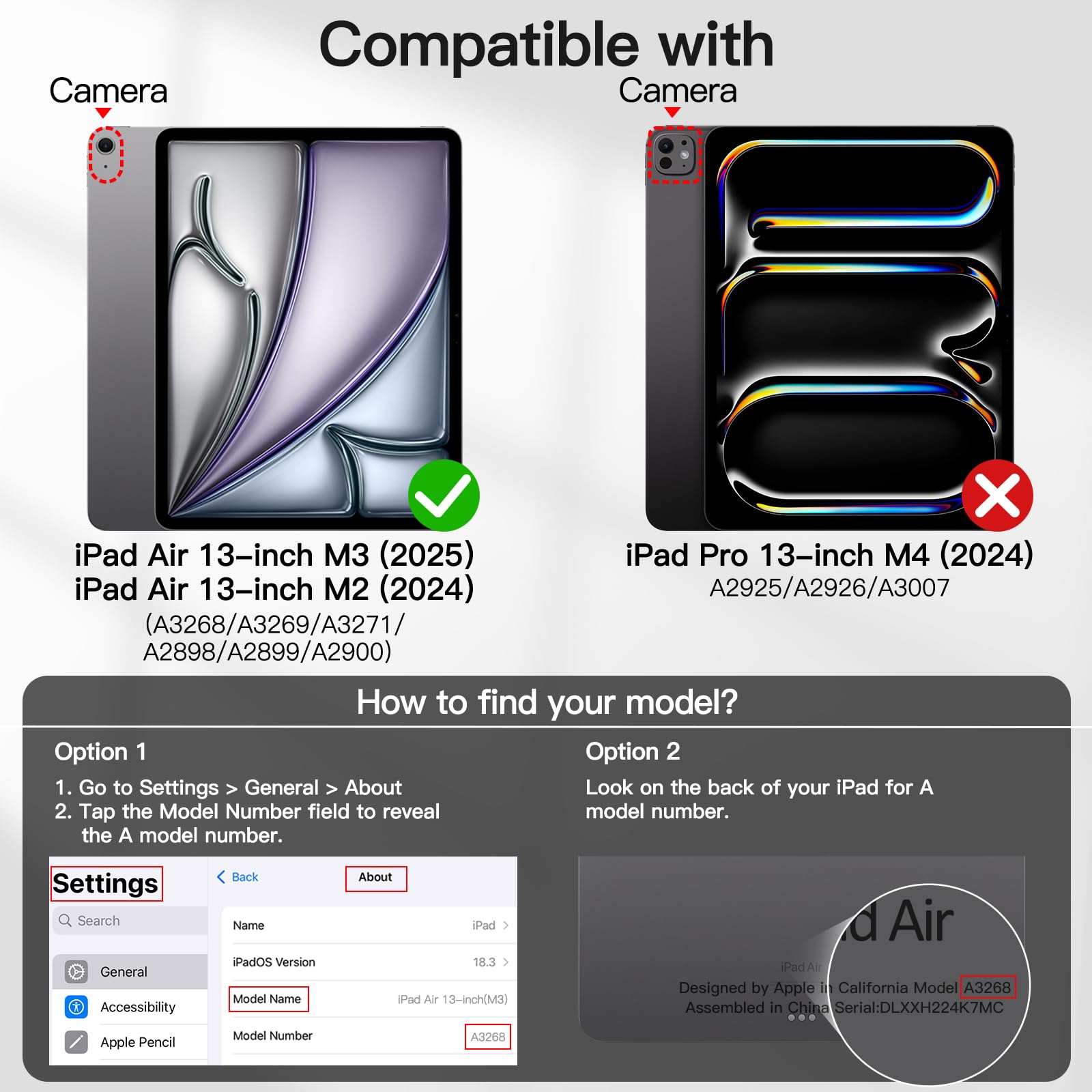 [Compatibility] Designed for iPad Air 13-inch M3/M2 (2025/2024). Fit iPad Model Numbers: A3268 / A3269 / A3271 / A2898 / A2899 / A2900. Please Go to Settings > General > About, then tap the Model Number field to reveal the A model number