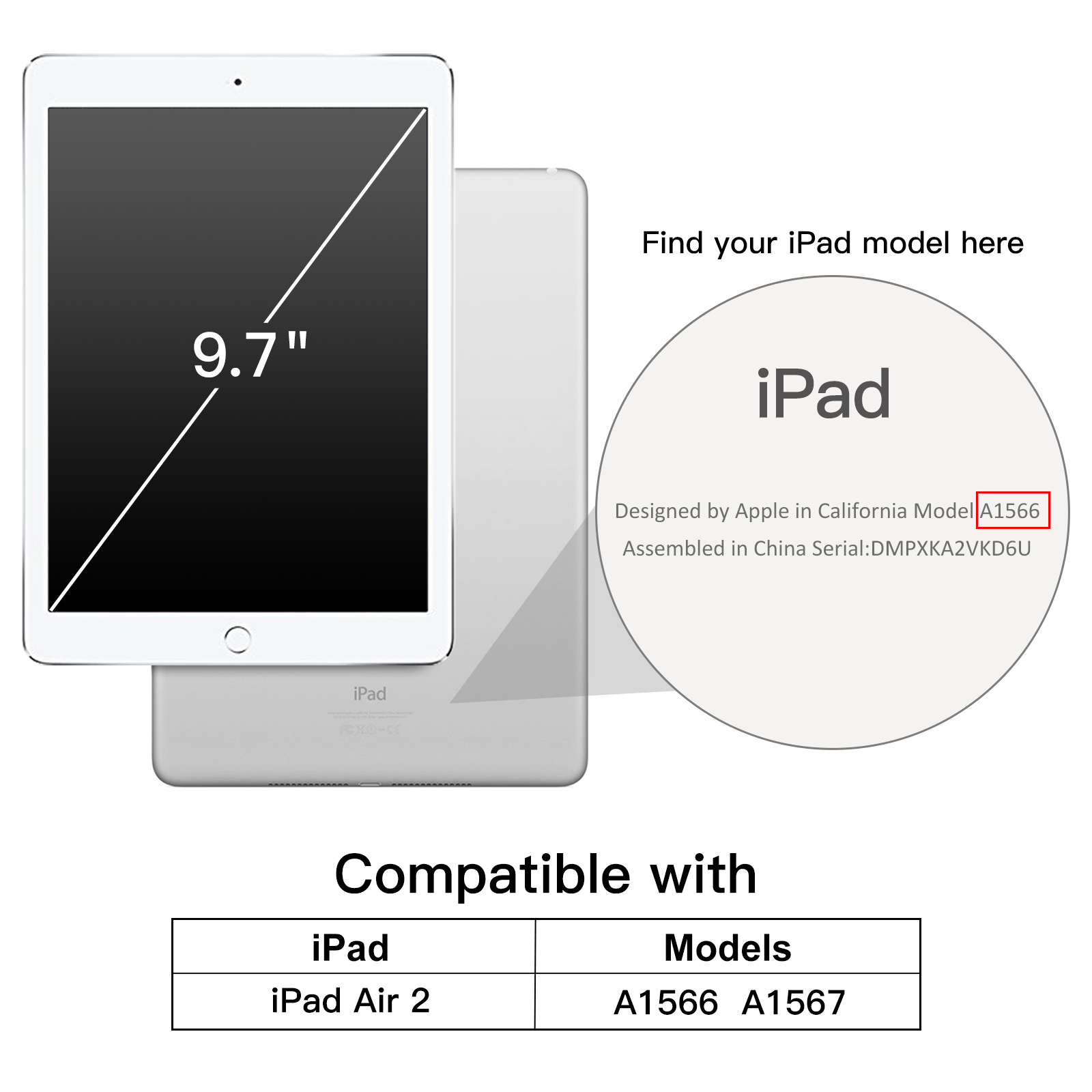 [Compatibility] Designed for iPad Air 2 9.7 Inch (2014 Model, 2nd Generation). Fit iPad Models: A1566 A1567. Please check the back bottom of your iPad to find the model number