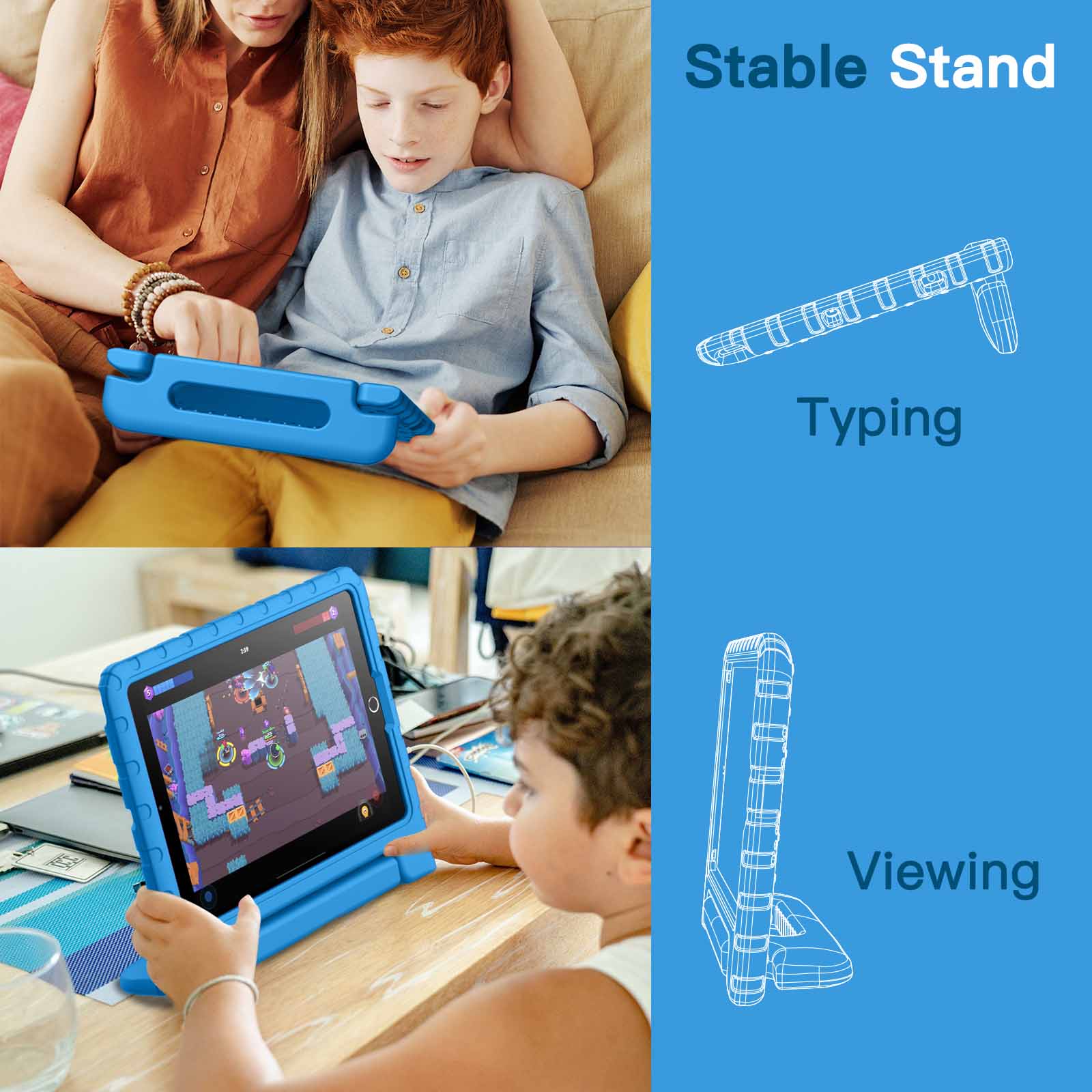 [Convertible Handle] Designed with a handle with anti-slip textures. It is easy for kids to carry around, and the handle can be folded back into a stand for hands-free viewing and comfortable typing