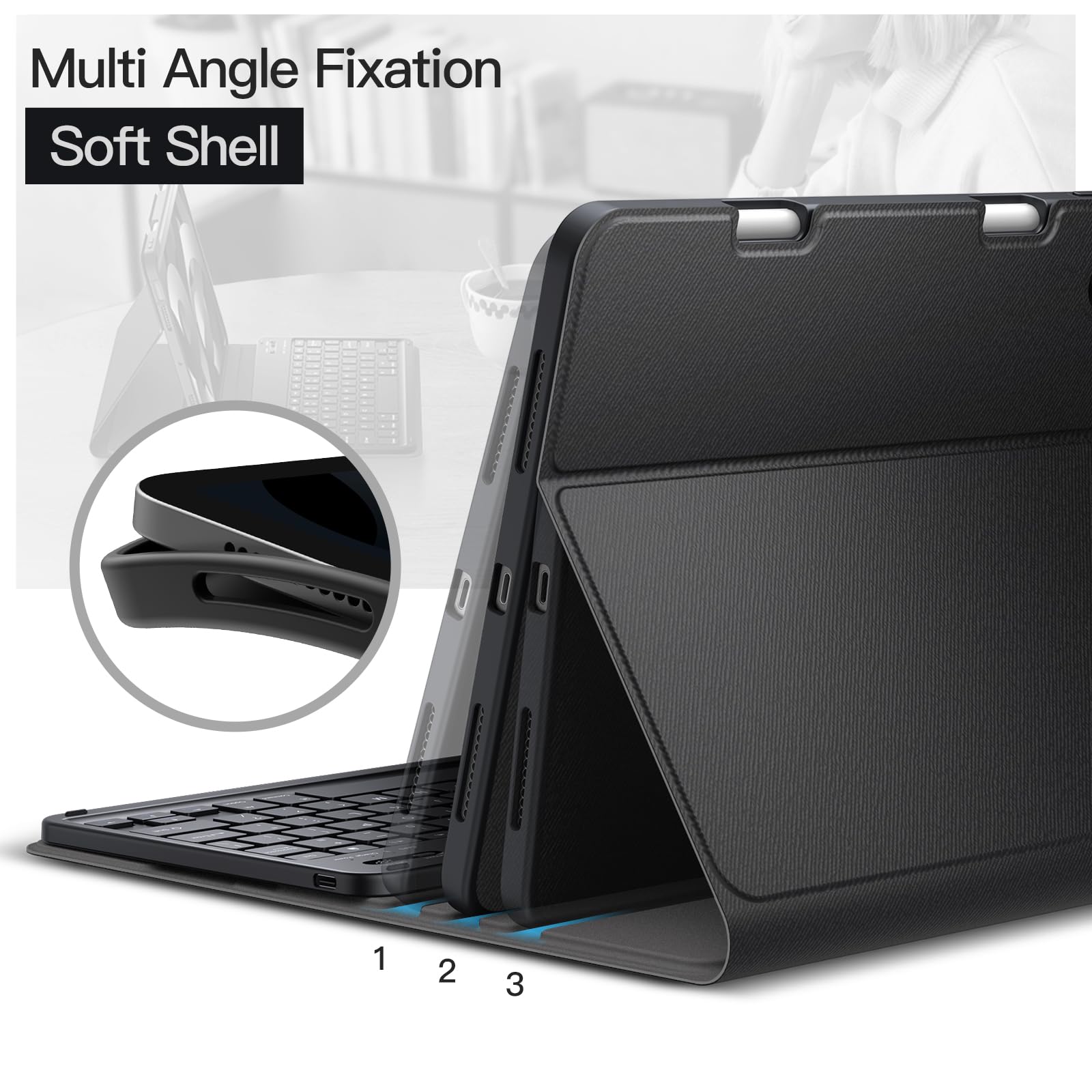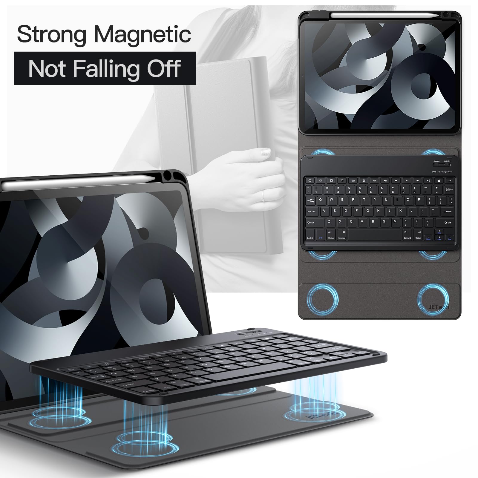 [Magnetic & Detachable Keyboard] The keyboard with easy-to-operate keys and stable Bluetooth connection can be attached to the cover with strong magnets, instantly turning your iPad into a laptop mode to improve the efficiency of working, learning or gaming. No fear of a sudden slide and you can remove it when not in use