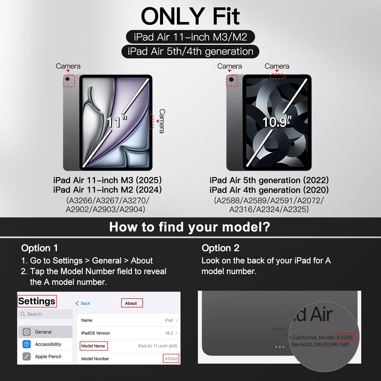 [Compatibility] Snugly fit iPad Air 11-inch M3/M2 (2025/2024), iPad Air 5/4 (2022/2020 5th/4th generation 10.9-inch). Fit iPad Models: A3266 / A3267 / A3270 / A2902 / A2903 / A2904 / A2588 / A2589 / A2591 / A2324 / A2072 / A2316 / A2325. Please Go to Settings > General > About, then tap the Model Number field to reveal the A model number