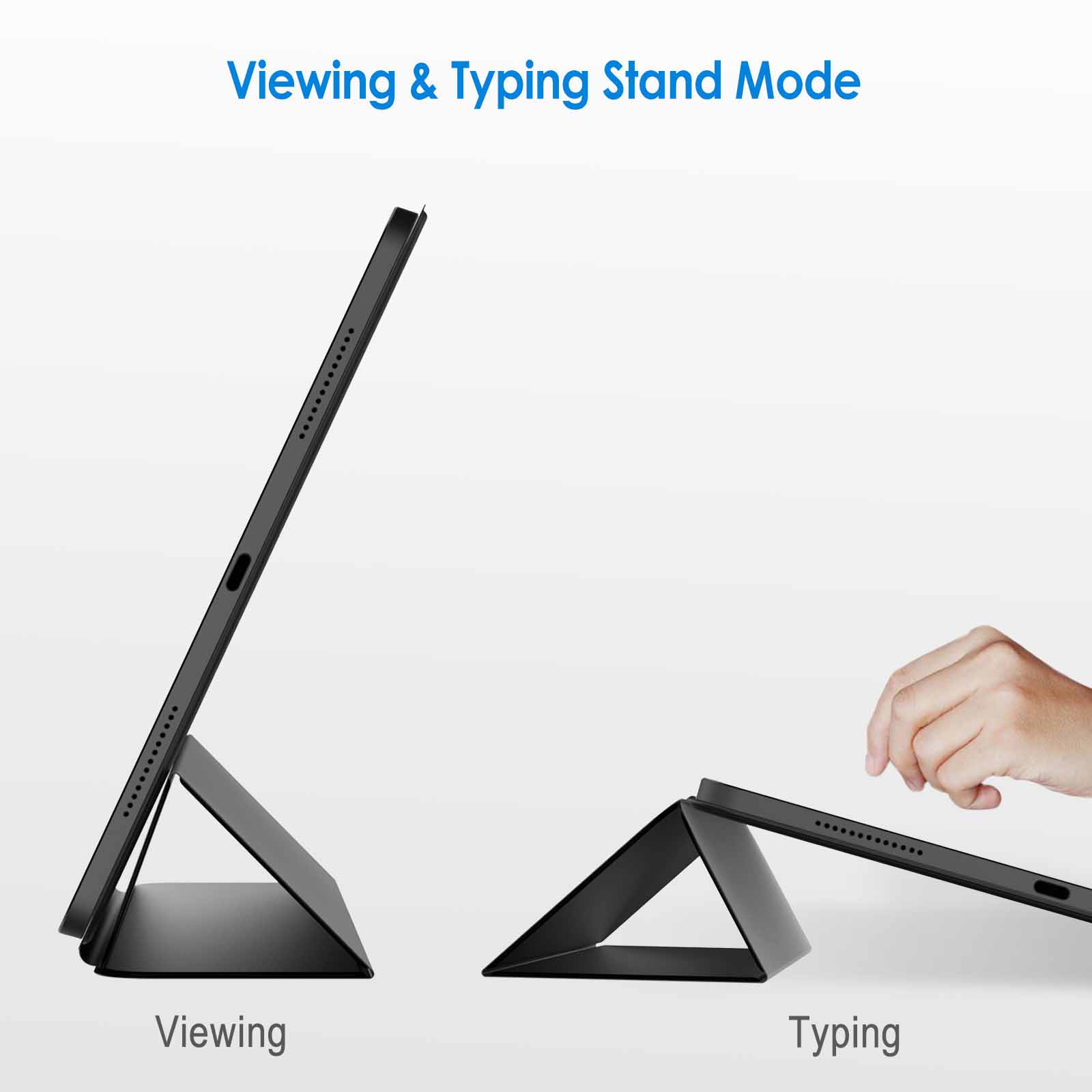 The tri-fold front cover can offer iPad two standing position for viewing and typing