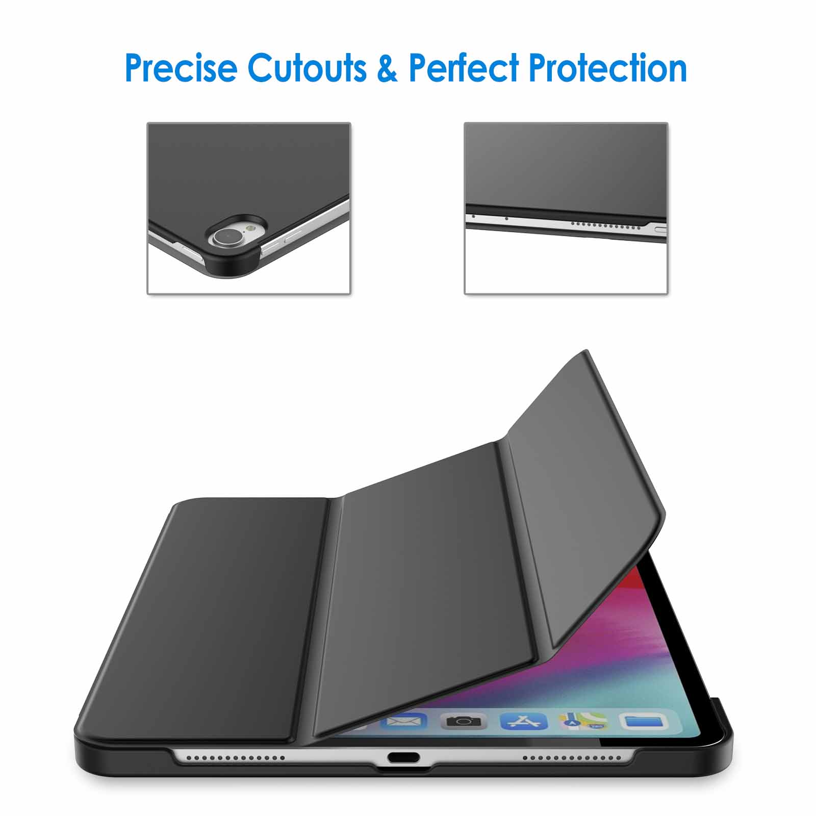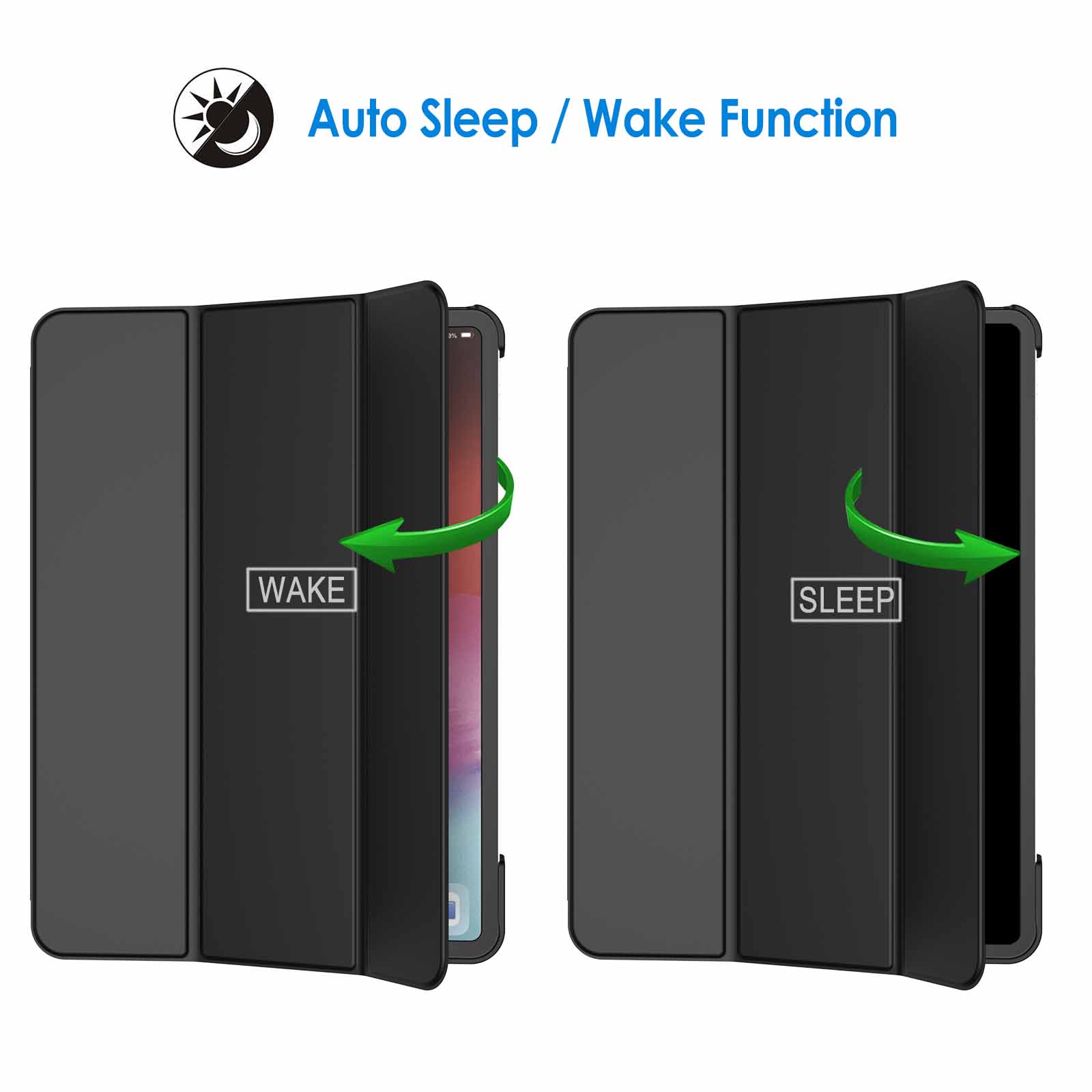 Magnetic smart cover supports automatic sleep/wake function. The tri-fold front cover can support iPad in two standing positions for viewing and typing