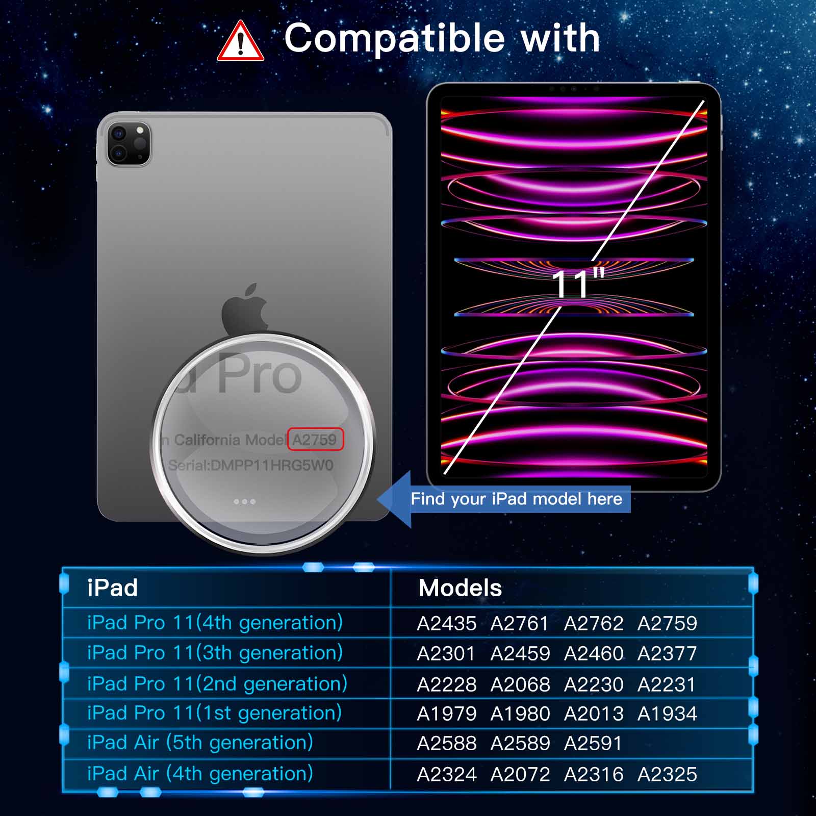 [Compatibility] Fit iPad Air 5/4 10.9-inch, iPad Pro 11-inch (2022/2021/2020/2018 model) Liquid Retina Display (NOT FOR iPad Pro 11-inch 2024 model). Fit iPad models: A2435 / A2761 / A2762 / A2588 / A2589 / A2591 / A2301 / A2459 / A2460 / A2377 / A2228 / A2068 / A2230 / A2231 / A1979 / A1980 / A2013 / A1934 / A2324 / A2072 / A2316 / A2325 / A2759. Please check back bottom of your iPad to find the model number