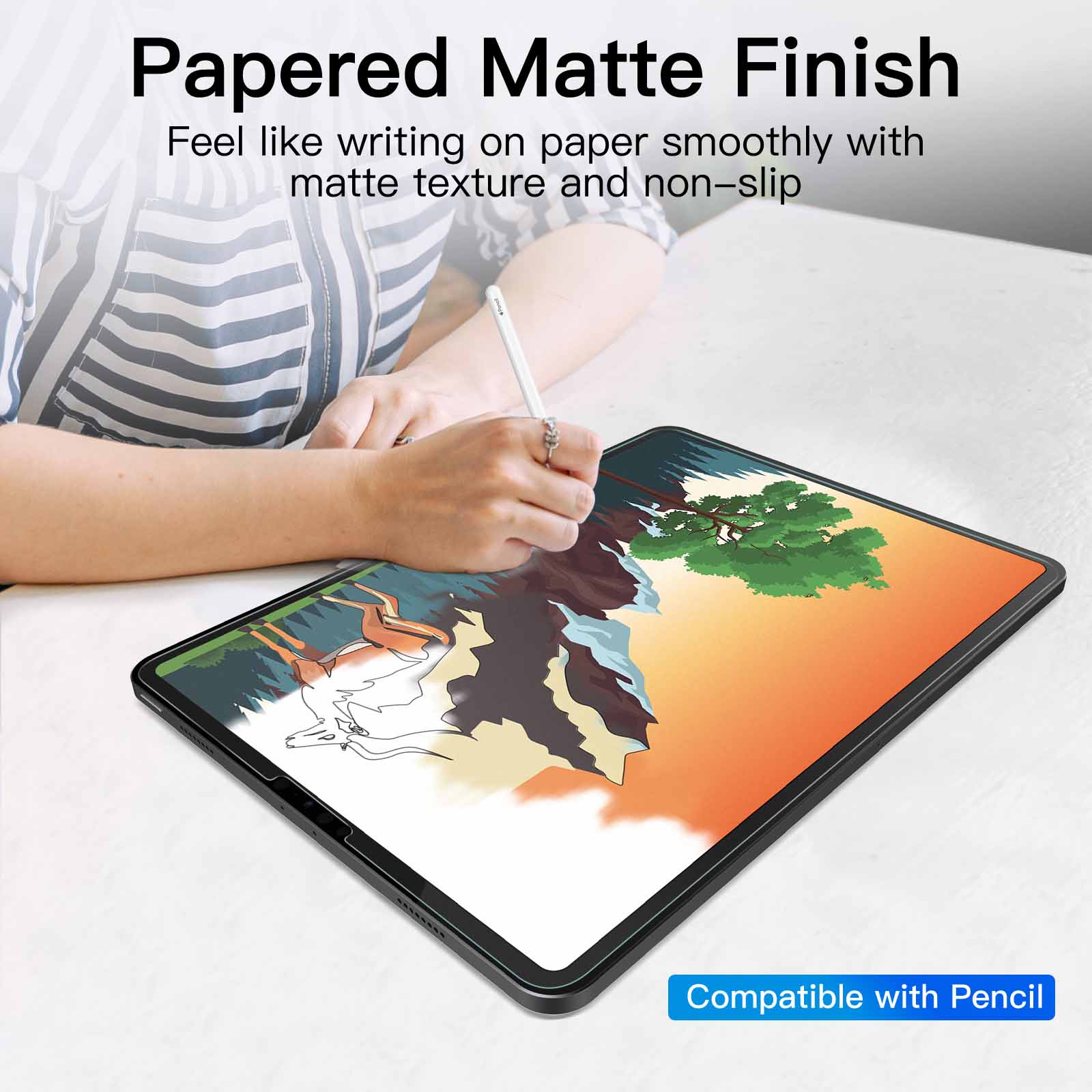 [Papered Coating] With a paper-matte finish material, it gives the sense of drawing, writing and touching on paper. Non-slip surface and easy to control your Pencil on the screen