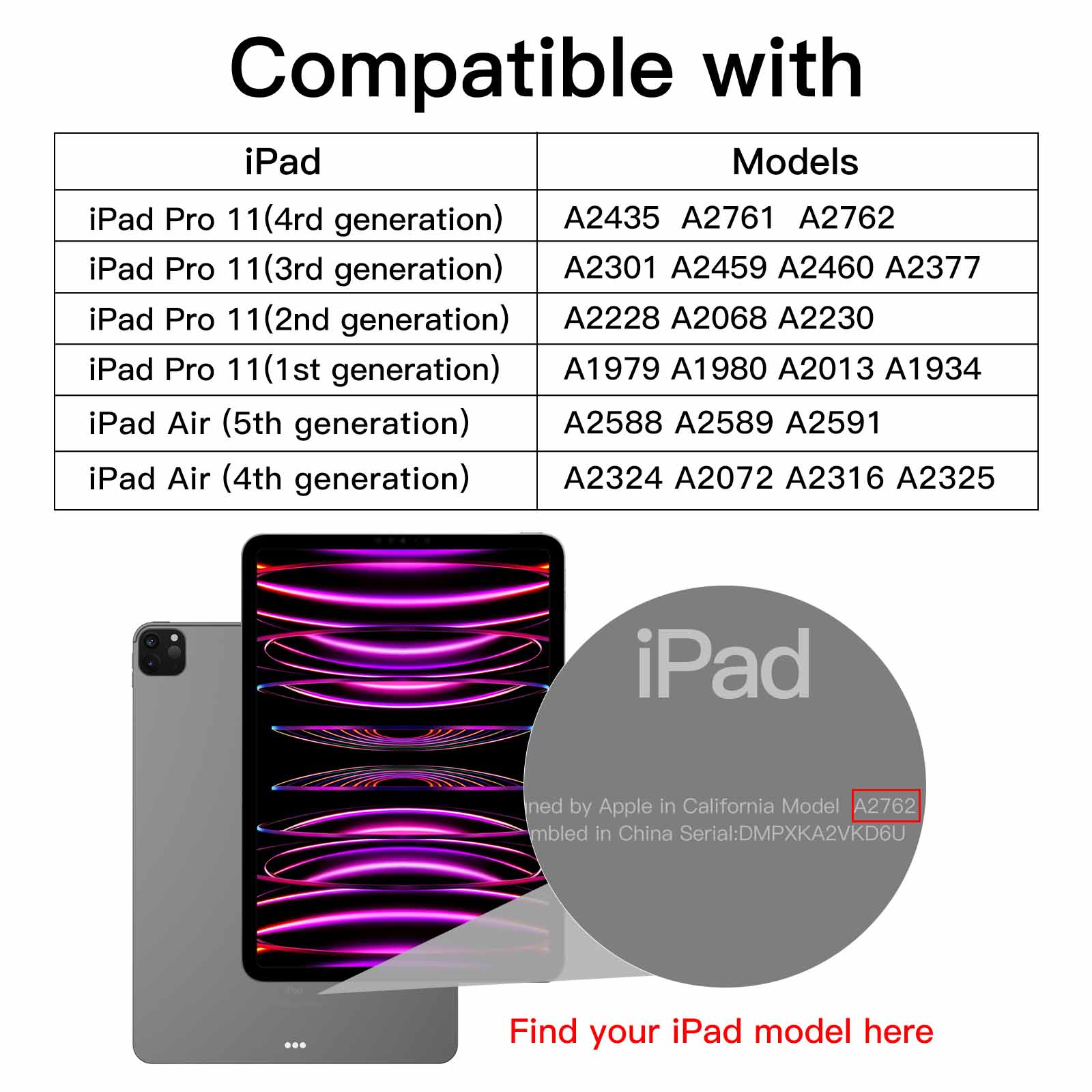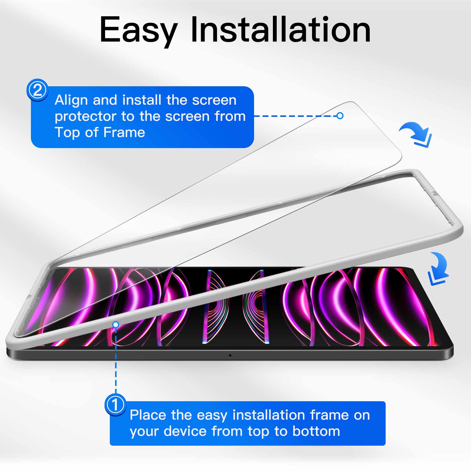 [Compatibility] Designed for iPad Air 5/4 10.9-inch and iPad Pro 11 (2022/2021/2020/2018 model). Fit iPad models: A2759 A2435 A2761 A2762 A2588 A2589 A2591 A2072 A2316 A2324 A2325 A2301 A2377 A2459 A2460 A2068 A2228 A2230 A2231 A1934 A1979 A1980 A2013 (NOT FOR iPad Pro 11-inch 2024 model). Package includes 1*Screen Protector, 1*Easy Installation Frame, cleaning kits and instructions
