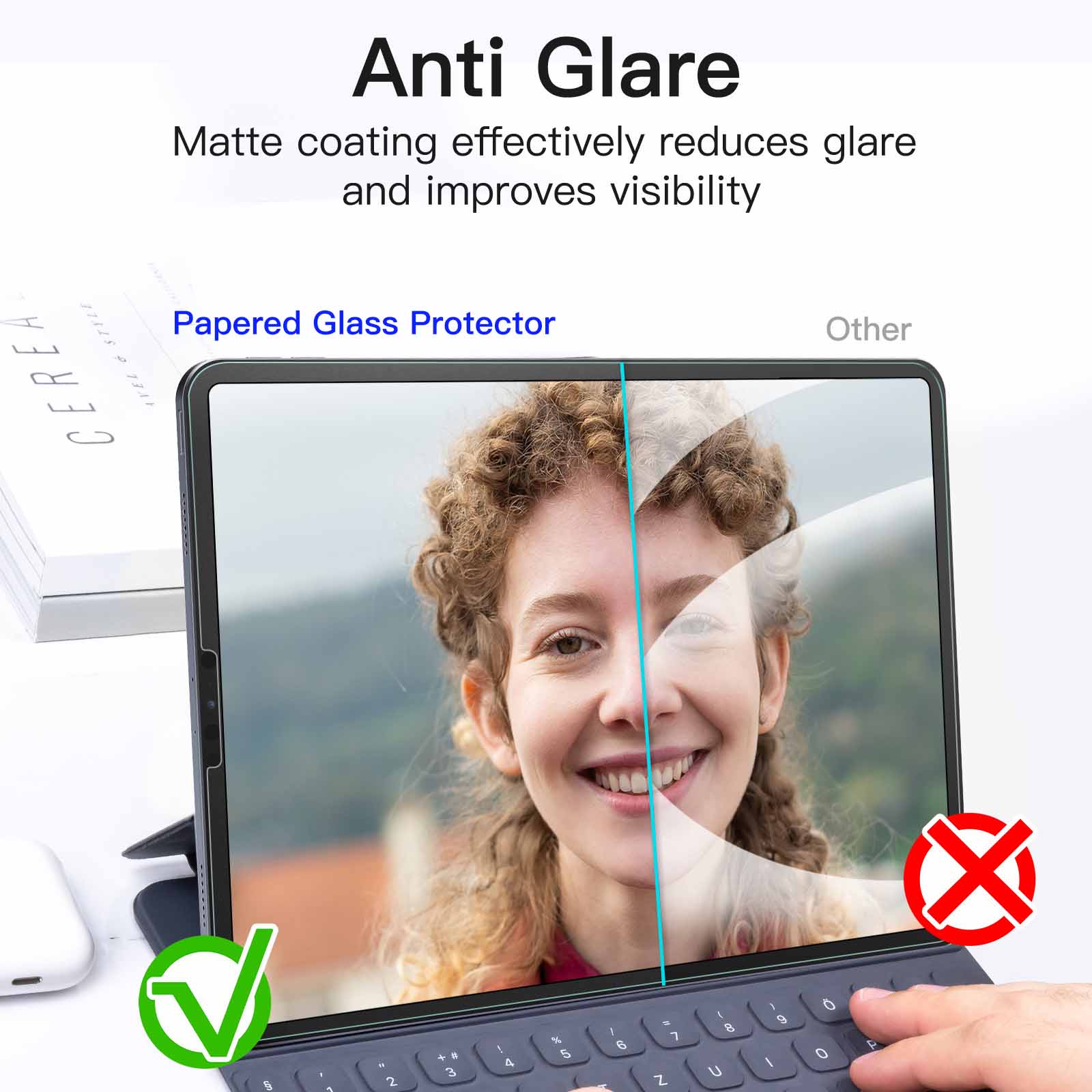 [Anti-Glare & Anti-Fingerprint] The papered characteristic reduces reflections and is anti-glare. It is not dazzling when reading in strong sunlight, outdoors or in light. Effectively keep your screen free from fingerprints and stain