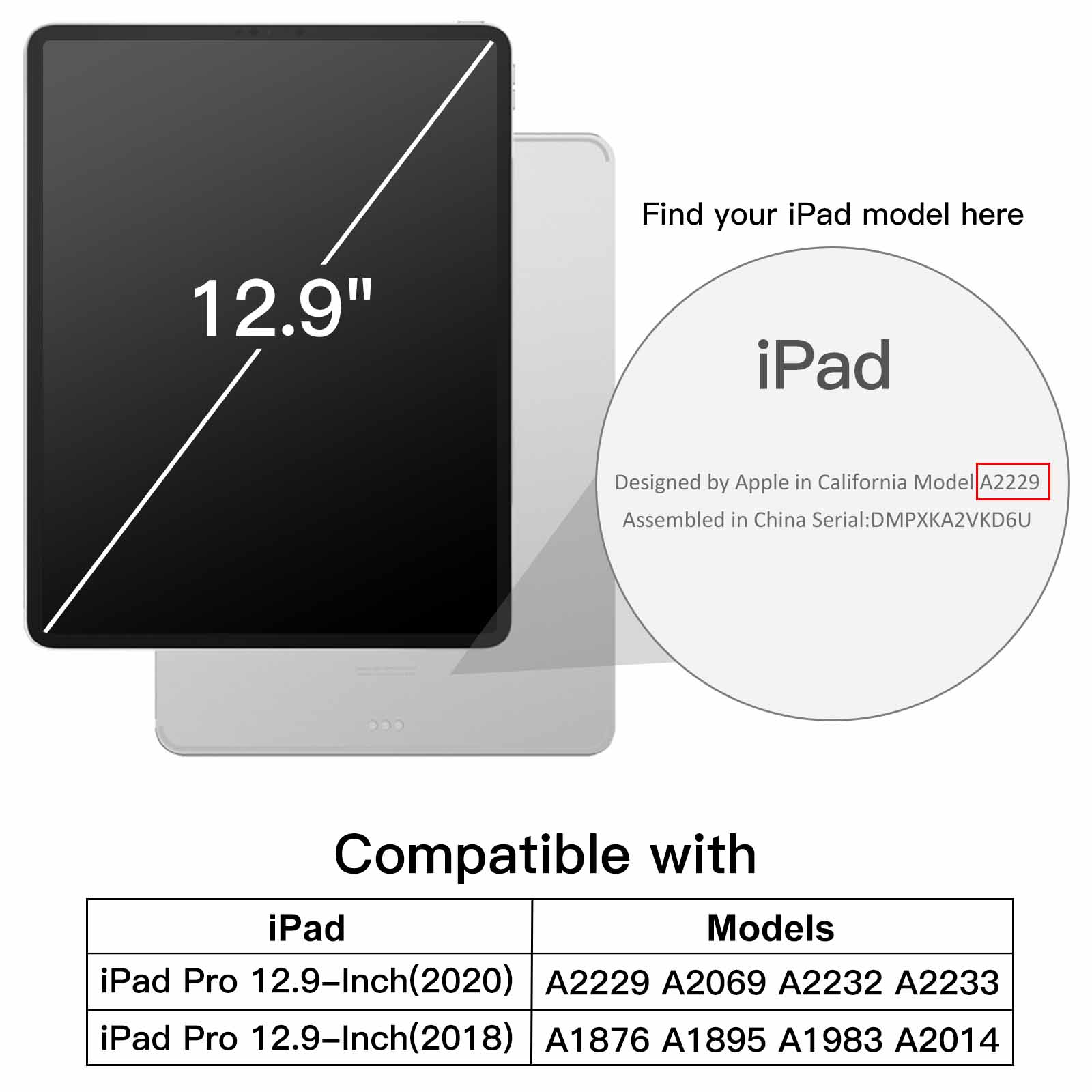 • Updated version compatible with Pencil charging. Designed for iPad Pro 12.9-inch (2020 / 2018 model). Fit iPad Models: A2229 A2069 A2232 A2233 A1876 A2014 A1895 A1983. Please check back bottom of your iPad to find the model number