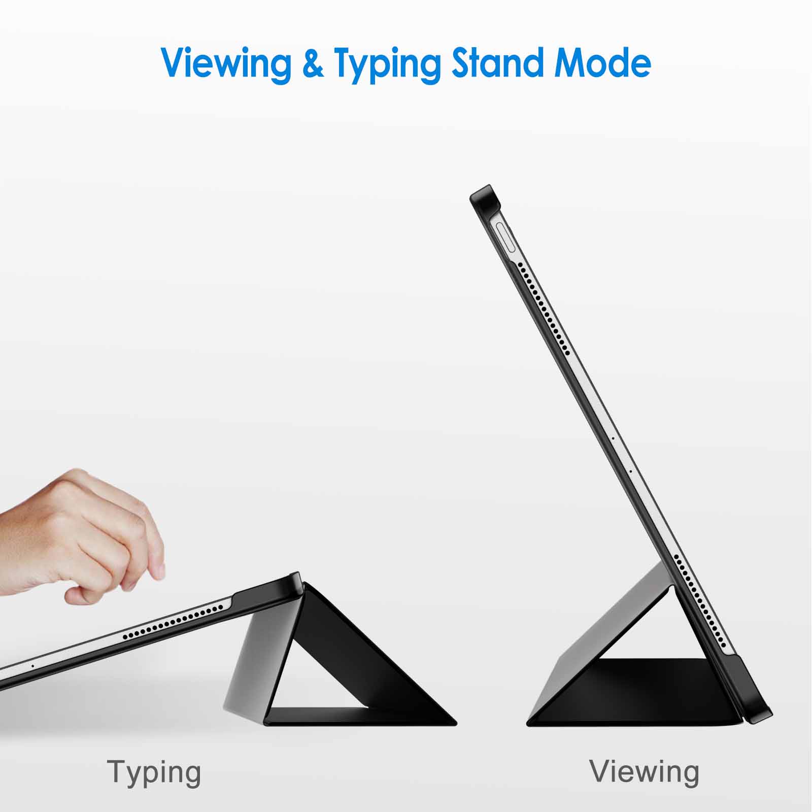 • Magnetic smart cover supports automatic sleep/wake function. The tri-fold front cover can support iPad in two standing position for viewing and typing