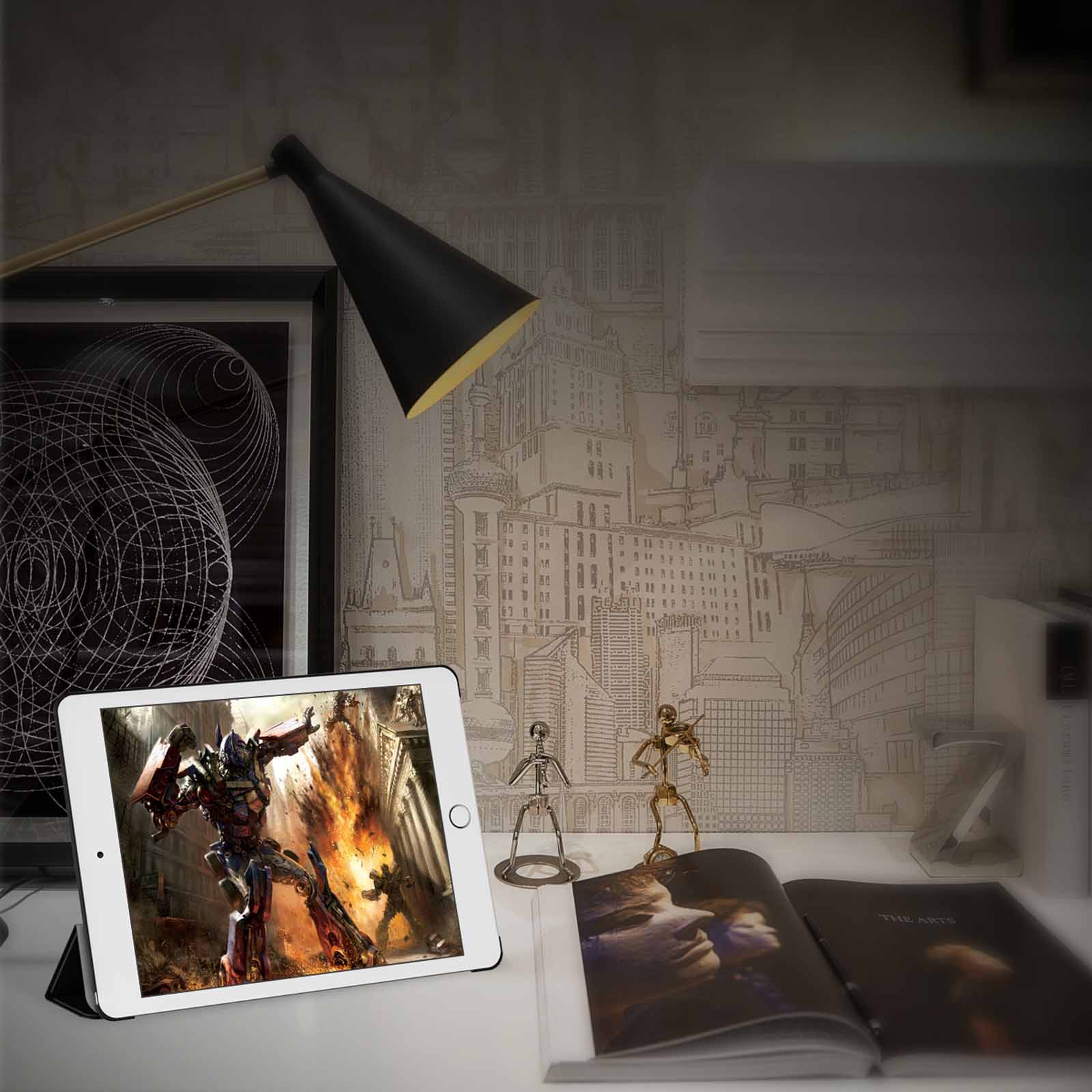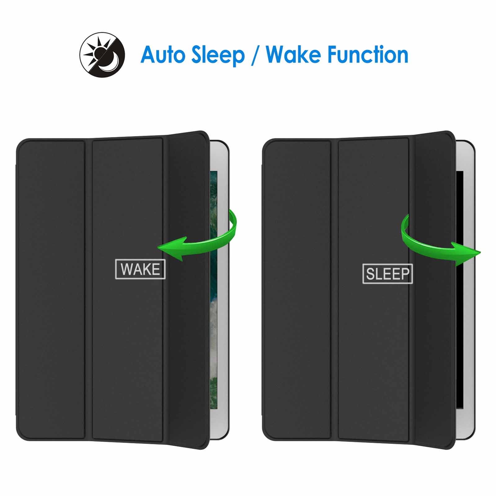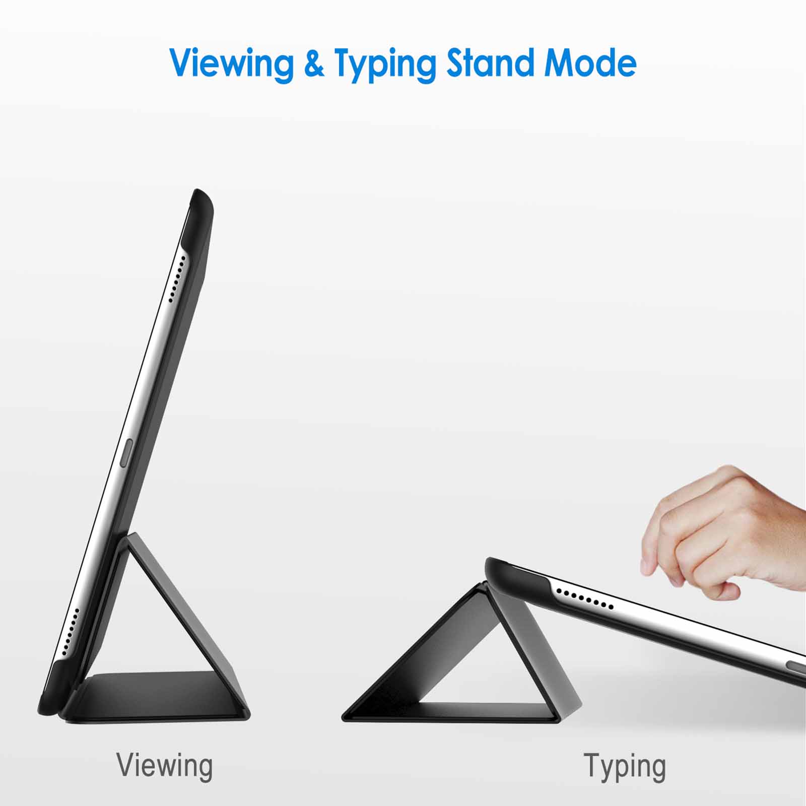Magnetic smart cover supports automatic sleep/wake function. The tri-fold front cover can support iPad in two standing positions for viewing and typing