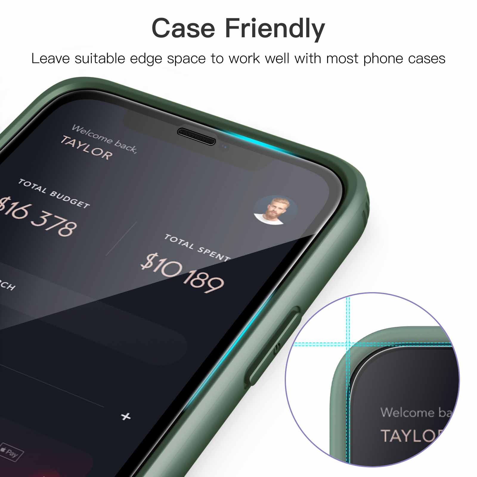 [Case-Friendly] There is enough edge space around the borders for your case to wrap around the edges of your mobile. Compatible with most phone cases