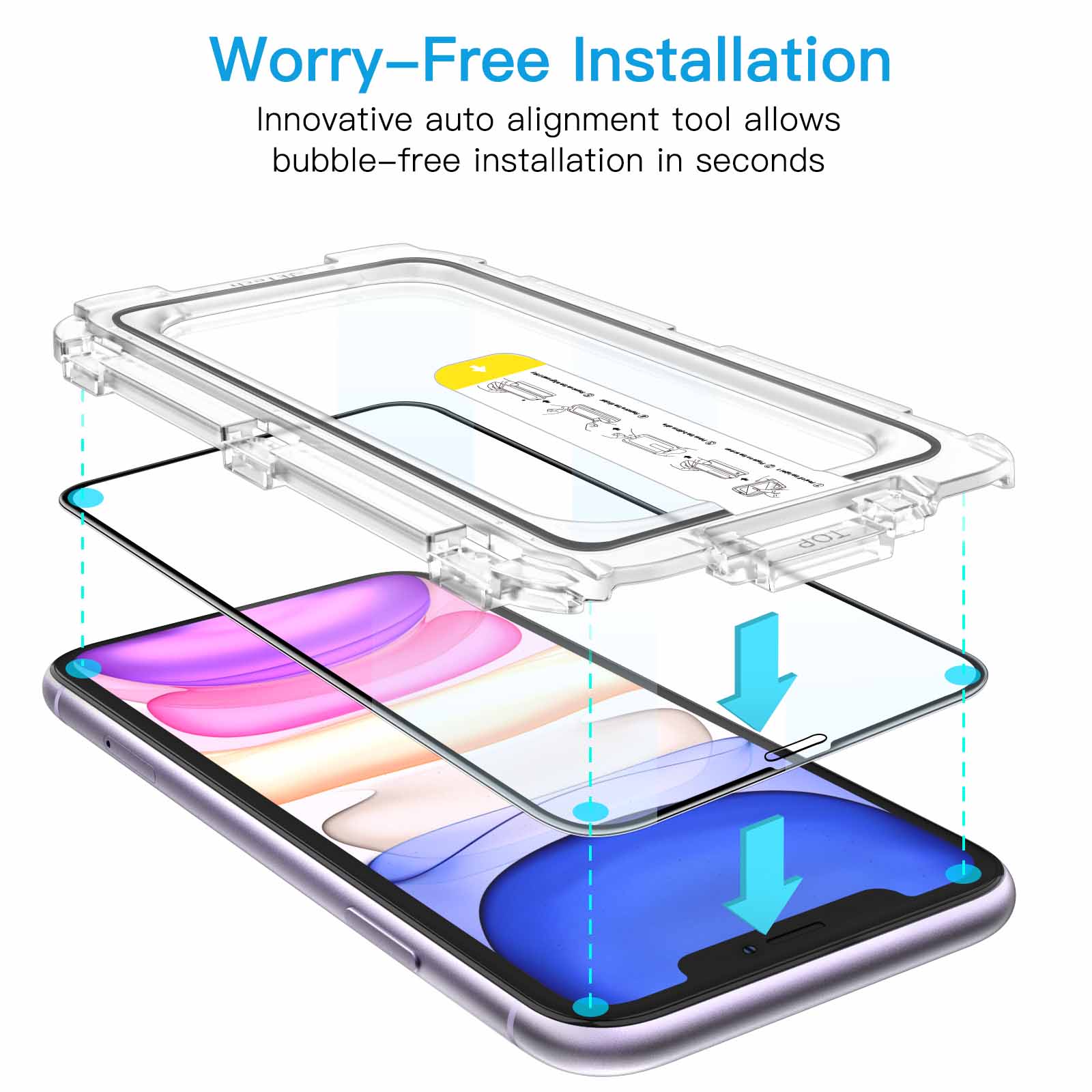 [One Touch Installation] Designed for iPhone 11/XR 6.1-inch. The screen protector is pre-set on the alignment tray. This innovative design makes it super easy and quick to align and install the screen protector perfectly to the screen without leaving any bubbles