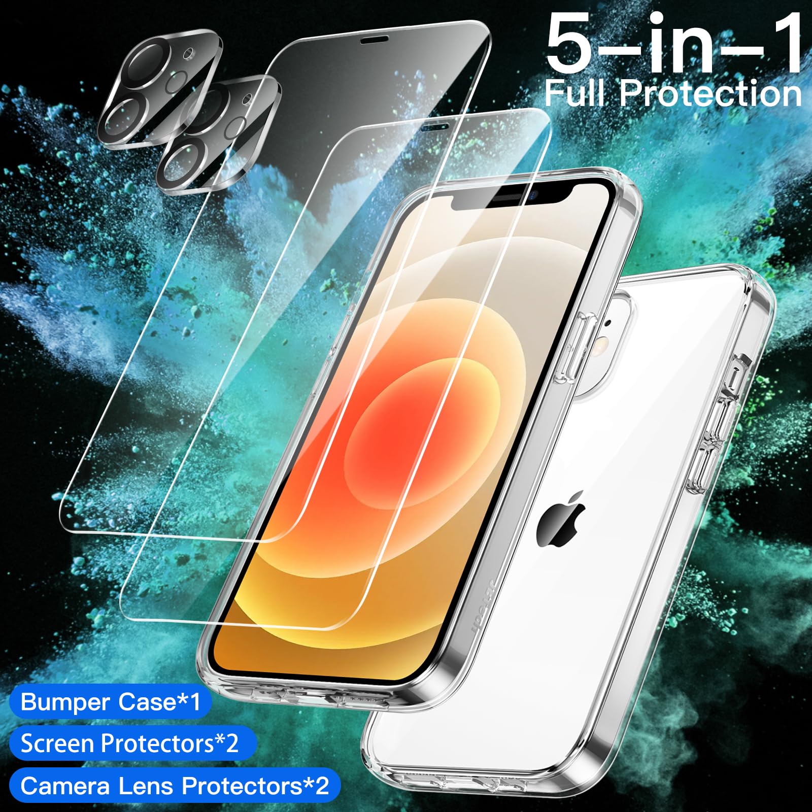 JETech 5 in 1 Case for iPhone 12 Mini 5.4-Inch, with 2-Pack Screen Protector and Camera Lens Protector, Non-Yellowing Shockproof Bumper Phone Cover, Full Coverage Tempered Glass Film