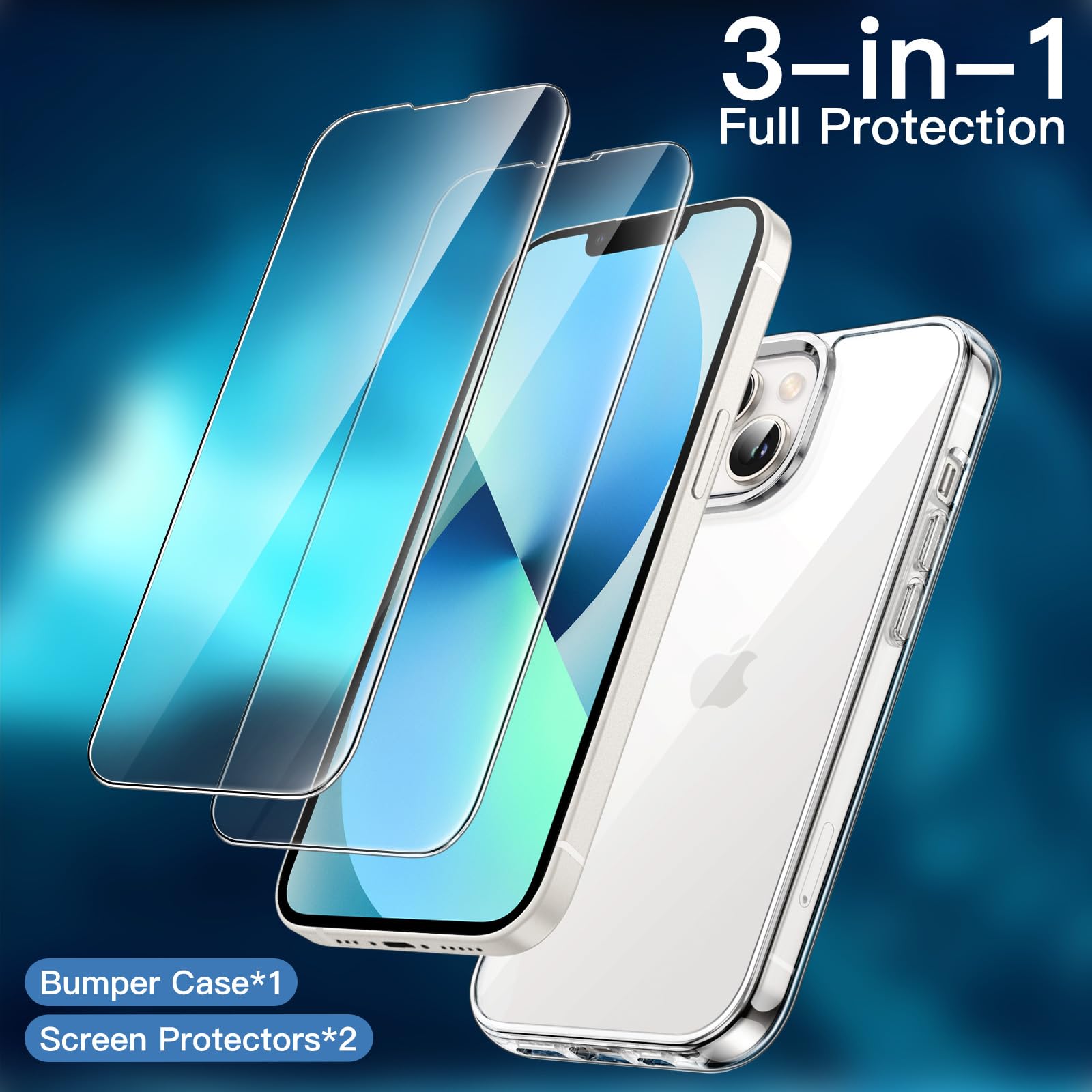 [3-in-1 High Protection] Tailor-made for iPhone 13 6.1-inch. You will receive a protective clear case and 2 pack tempered glass screen protectors, bringing comprehensive protection to your device