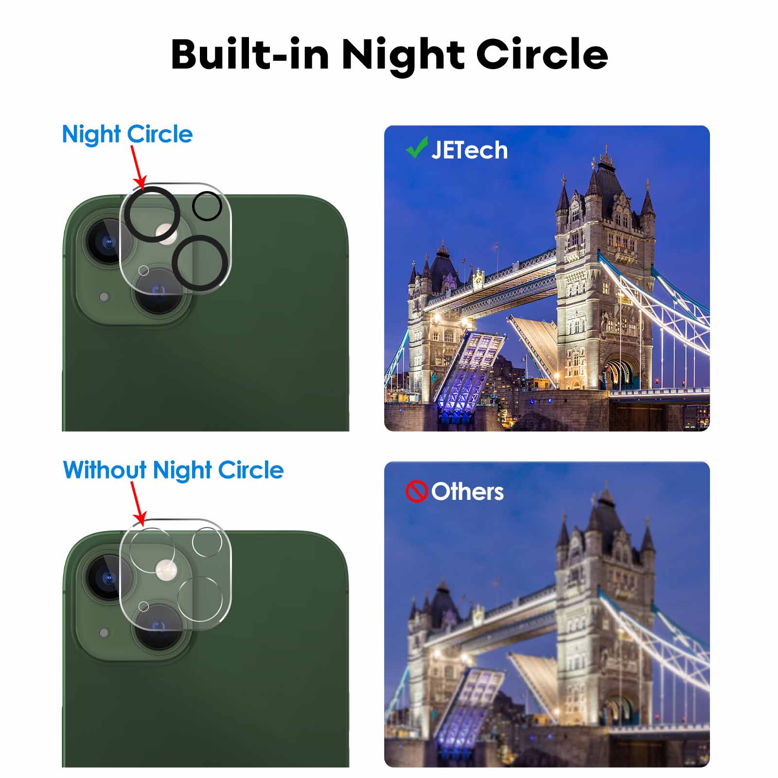 • [Night Shooting Mode] The camera lens protector with upgraded built-in night circle allows you to use the flash function normally at night. High light transmittance ensures the original quality of pictures and videos