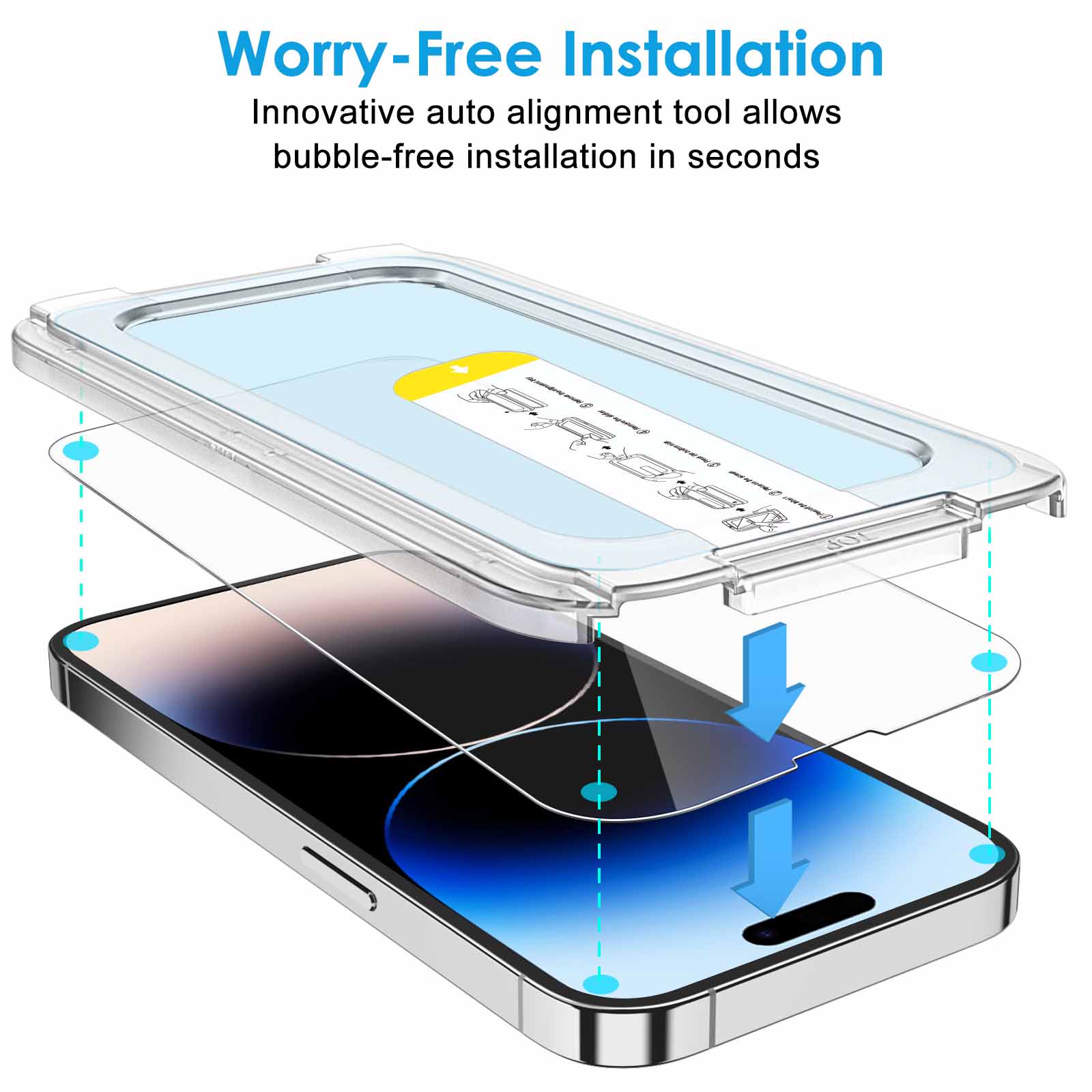 Note: Remove the two tabs film if it remains on the screen protector. [One Touch Installation] Designed for iPhone 14 Pro Max 6.7-inch. The innovative alignment tool with screen protector preset makes it super easy and quick to install and no bubbles left