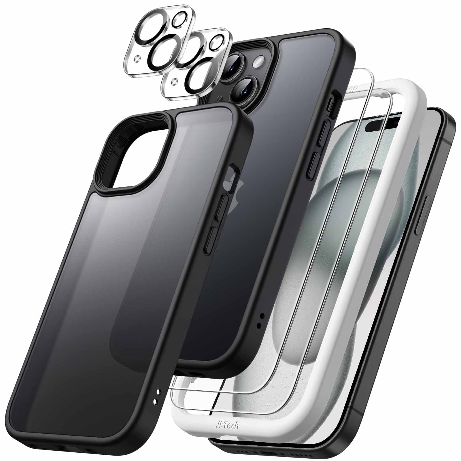 JETech 5 in 1 Matte Case for iPhone 15 6.1-Inch with 2-Pack Each Tempered Glass Screen Protector and Camera Lens Protector, Translucent Back Shockproof Phone Cover