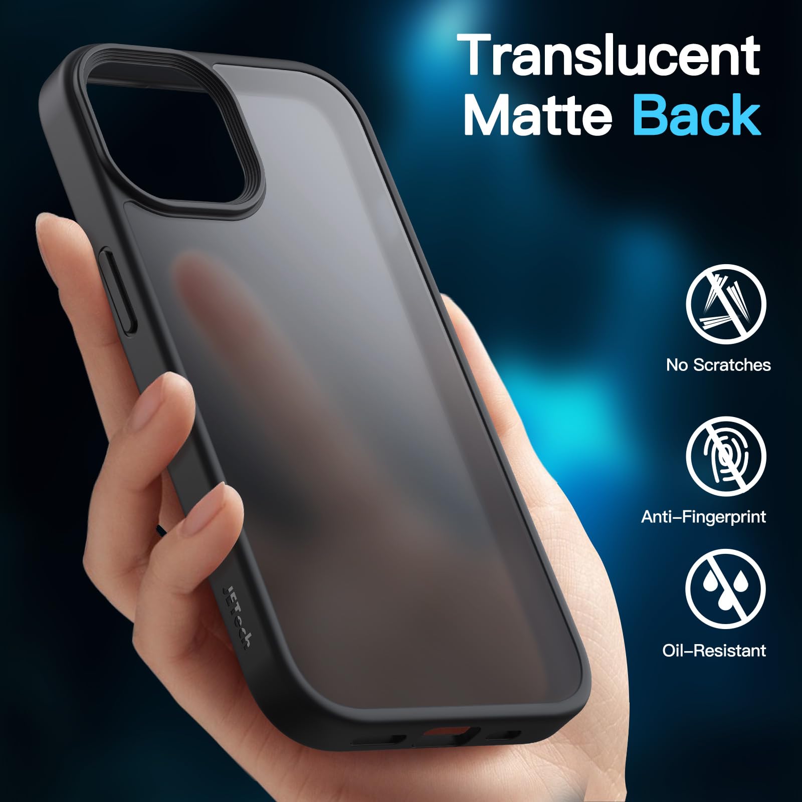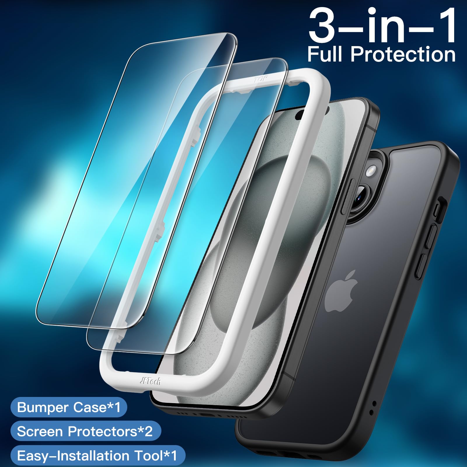 JETech 3 in 1 Matte Case for iPhone 15 6.1-Inch with 2-Pack Tempered Glass Screen Protector, Translucent Frosted Shockproof Phone Cover